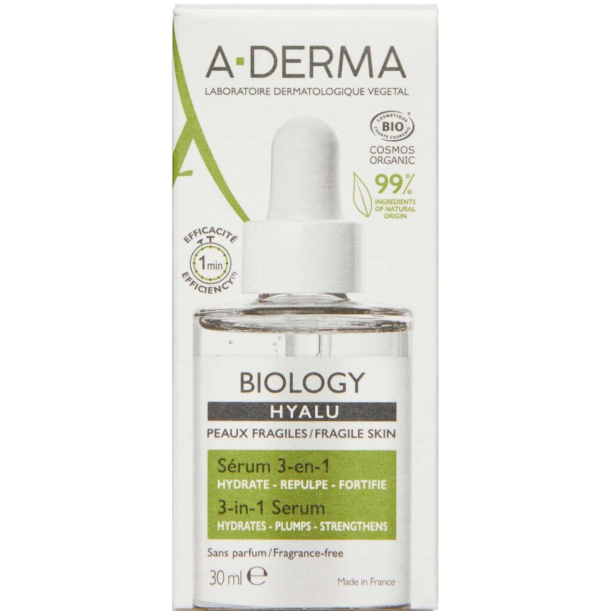 A-Derma BIOLOGY Hyalu 3-in-1 Serum er dermatologisk og økologisk certificeret 3-i-1 serum til sart hud i ansigtet. Giver øjeblikkeligt intensivt fugt takket være Rhealba Havrekim plantesaft + 1% hyalyronsyre. Giver fylde til huden, gør den mere smidig, og huden genvinder sin glød. Styrker hudbarrieren takket være Rhealba Havrekim plantesaft samt "Florin d'Or" ekstrakt, som danner et skjold mod forureningspartikler.