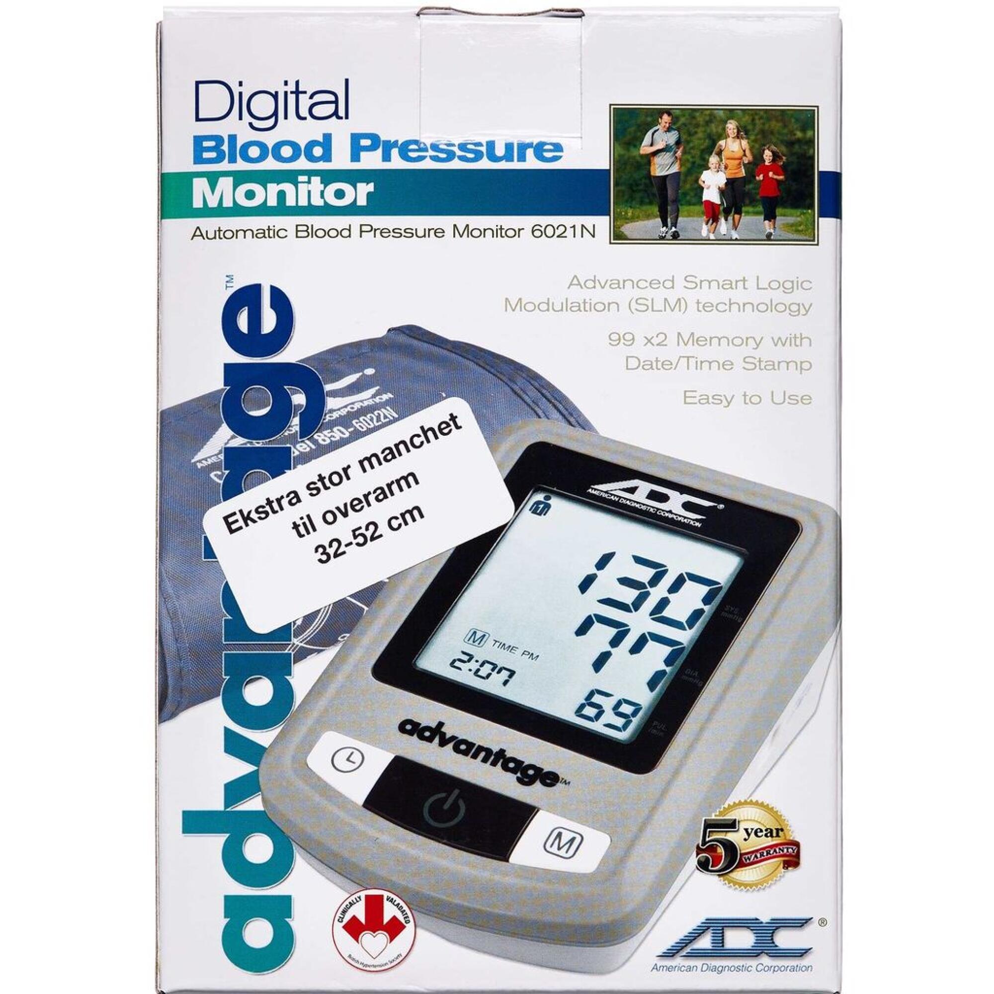 ADC blodtryksapparat med manchet XXL passer til overarm 32-52 cm. BHS godkendt i klasse AA garanterer præcise målinger. Anvender Smart Logic™ til at fastlægge det nødvendige tryk i manchetten under målingen, og derved sikres, at der ikke presses unødvendigt hårdt. ADC blodtryksapparat gemmer de seneste 99 målinger med tidsangivelse, og der er mulighed for hukommelse for 2 brugere.