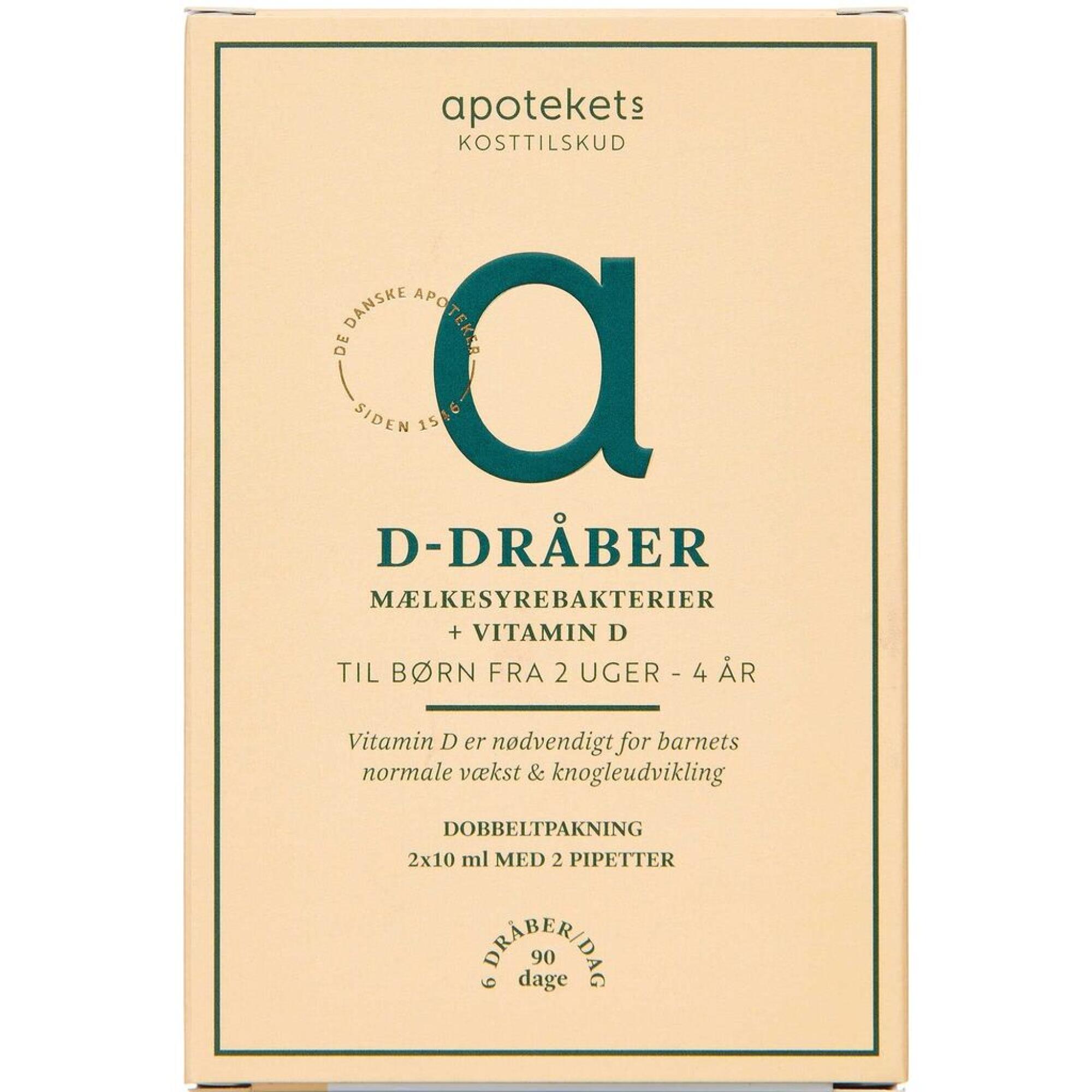 Apotekets D-dråber med mælkesyrebakterier er et 2-i-1 kosttilskud med mælkesyrebakterier og vitamin D3 til børn fra 2 uger og op til 4 år. Apotekets D-dråber er med til at give barnet den bedste start på livet.