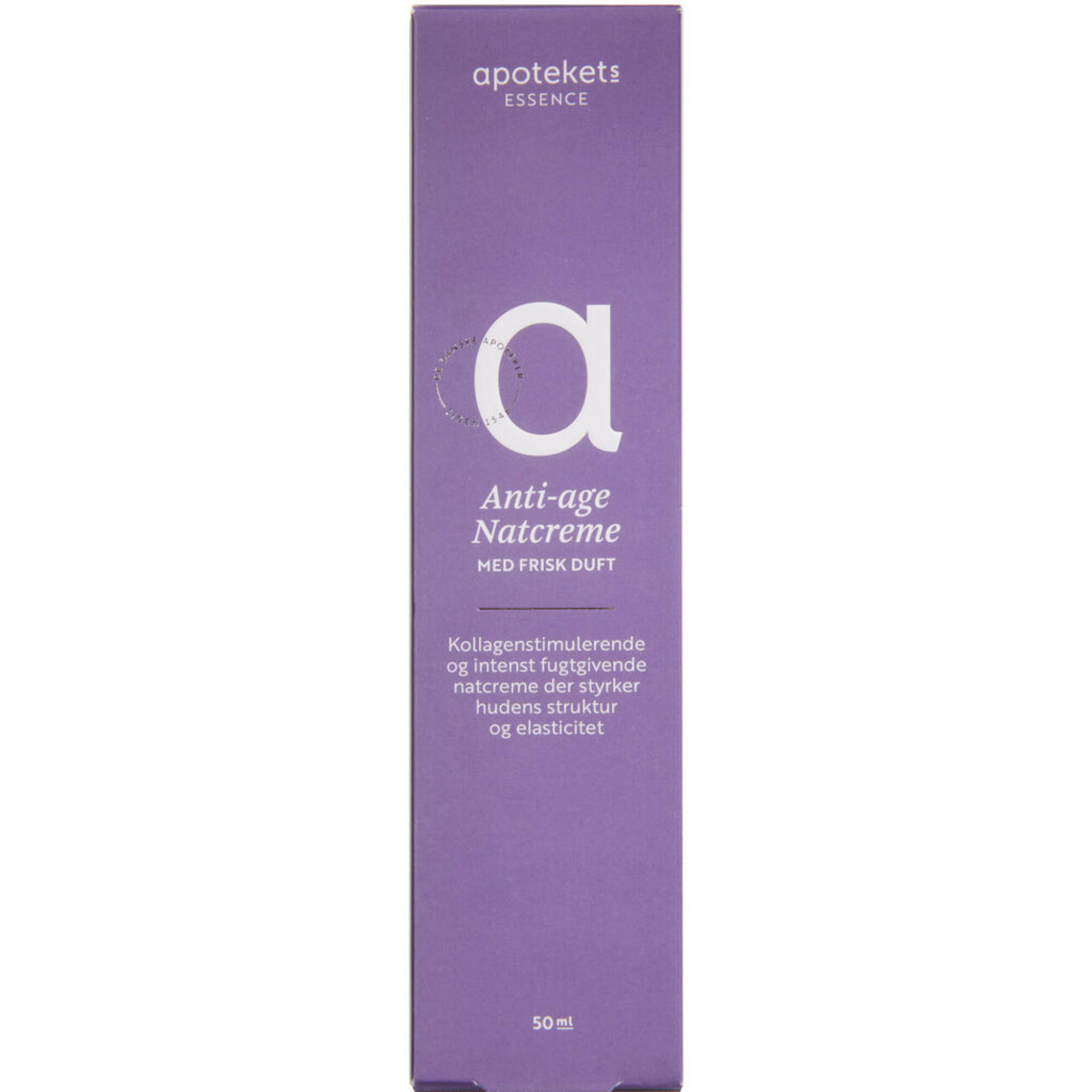 Apotekets Essence Anti-age natcreme understøtter den vigtige skønhedssøvn ved at tilføje ceramider, det aktive peptidkompleks Matrixyl, to kollagenstimulerende algeekstrakter og vegetabilsk glycerin, der beroliger ansigtshuden og mætter den med fugt.