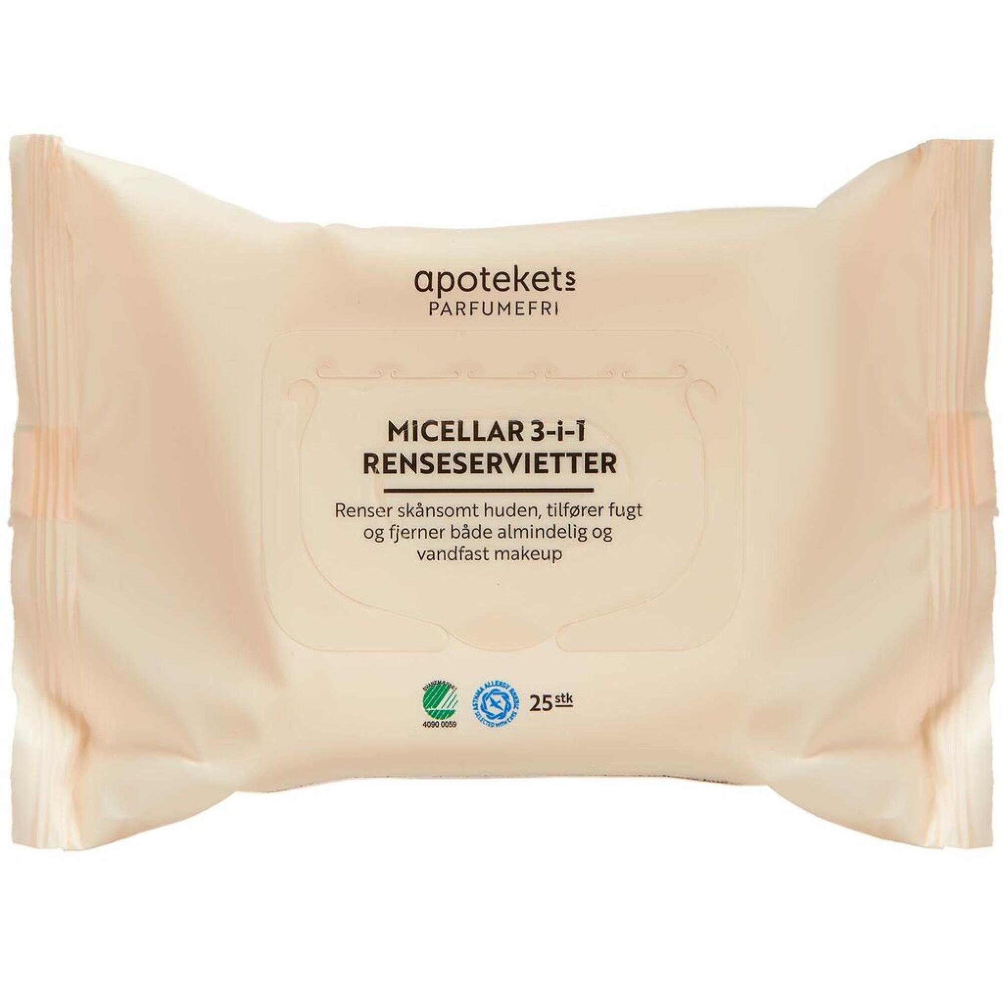 Apotekets Parfumefri Micellar 3i1 Renseserviet fjerner skånsomt makeup, øjenmakeup og snavs uden at udtørre huden.