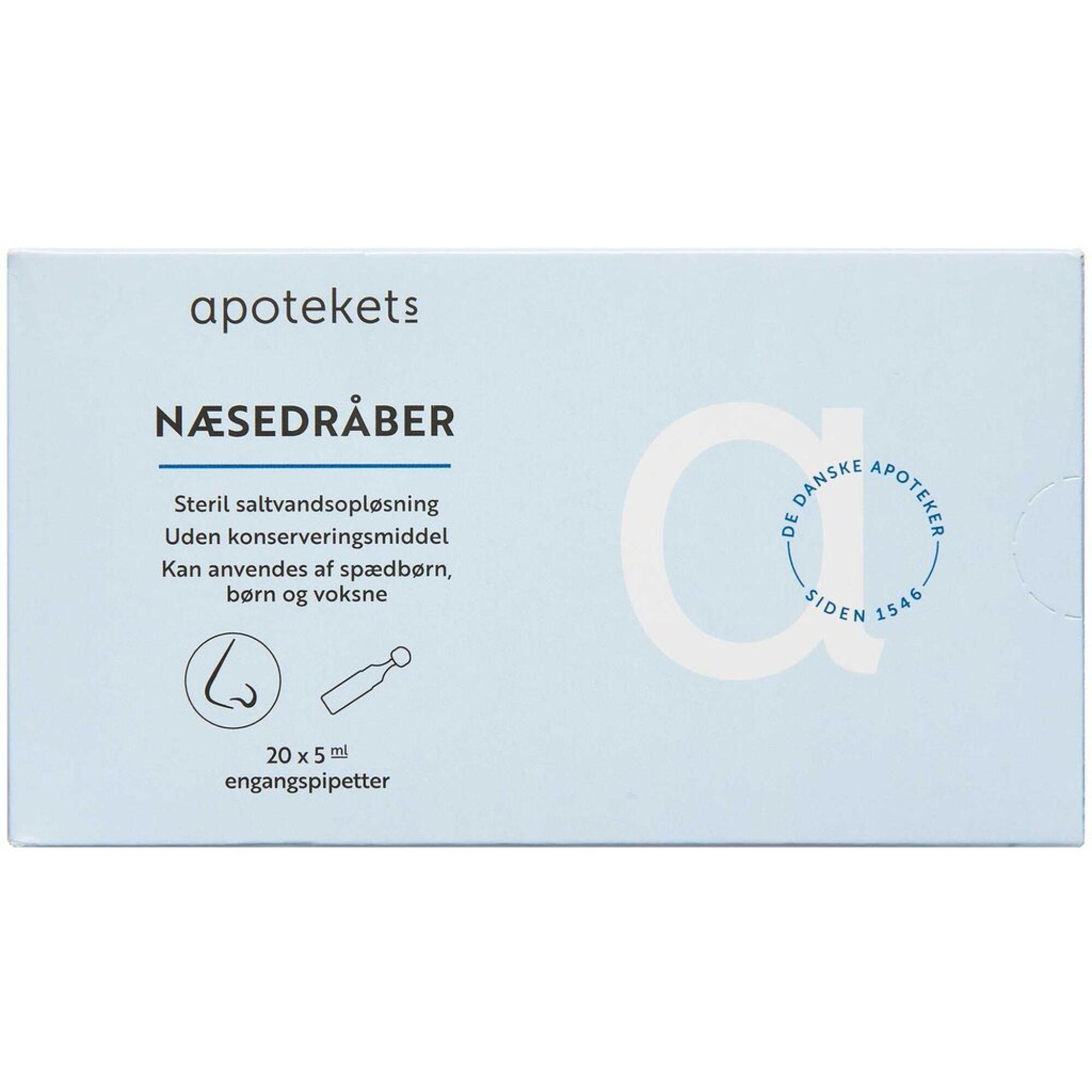Apotekets Næsedråber er en saltvandsopløsning i engangspipetter med sterilt saltvand, der er velegnet til rensning og fugtning af næseslimhinden, hvilket letter fimrehårenes naturlige rensefunktion og har samme saltkoncentration som kroppens væsker.