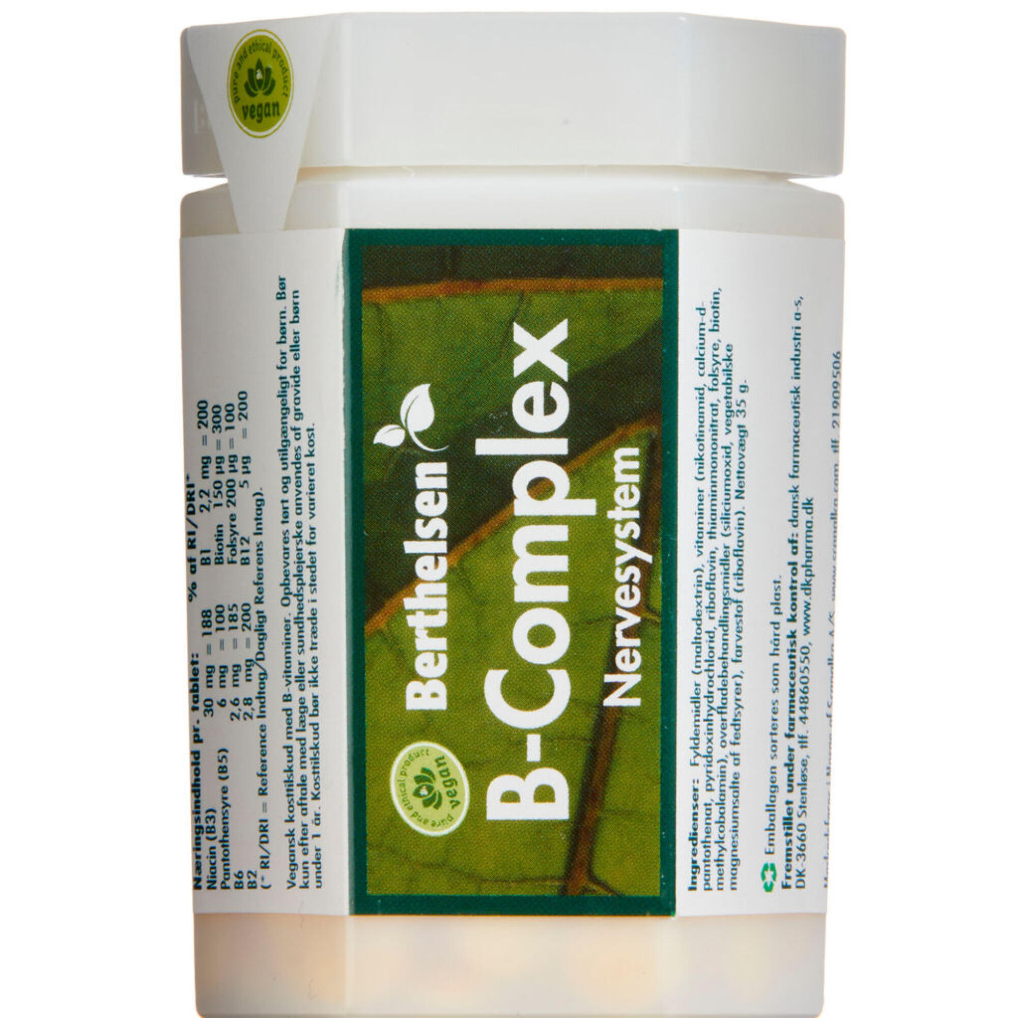 Berthelsen B-Complex er et blandet stærkt vegansk B-vitamin præperat med stor koncentration af alle B-vitaminerne. B-Complex sørger for, at du er godt dækket ind med alle 8 B-vitaminer. Det anbefales at tage flere B-vitaminer sammen, da B-vitaminerne afhænger af hinanden og styrker hinandens effekt.