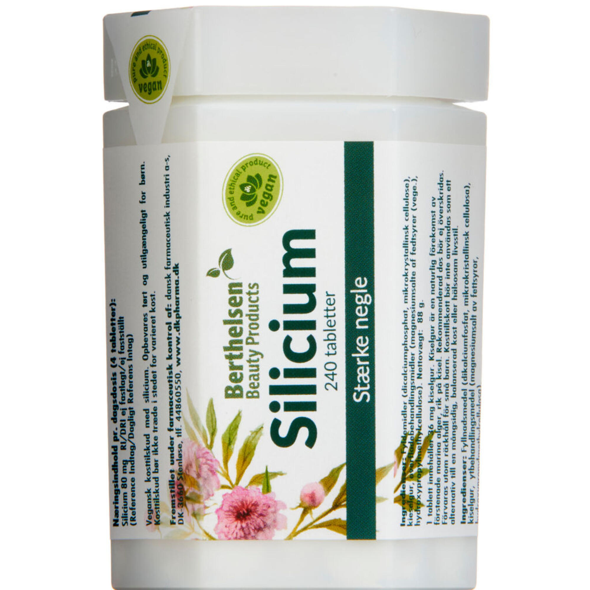 Berthelsen Naturlig Silicium fra Berthelsen er et kosttilskud som indeholder Silicium i form af kieselgur. Silicium har betydning for stærke negle og hår.