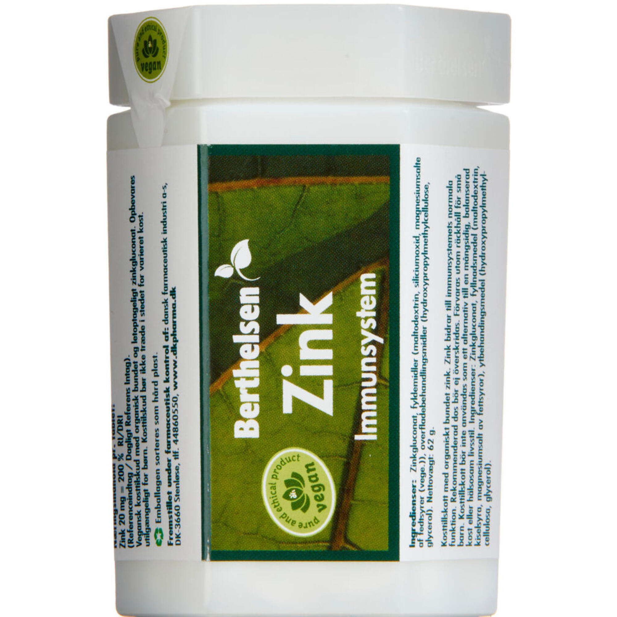 Berthelsen Naturlig Zink indeholder organisk og letoptagelig zink i form af zinkgluconat som er et livsvigtigt spormineral med stor betydning for kroppens optimale funktion.