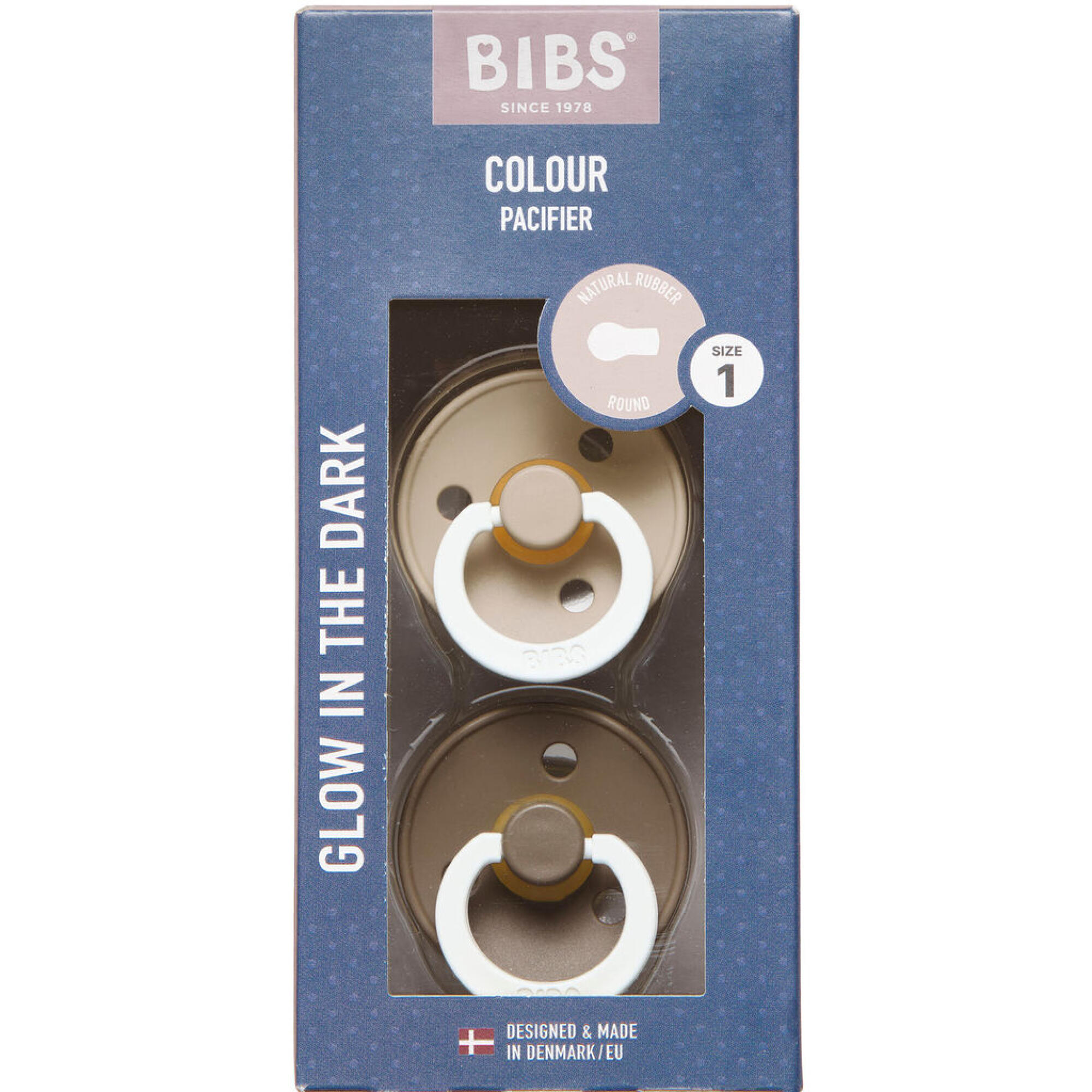 Læs mere om kundeklubbenBIBS Colour Glow Sut Latex Str. 1, Vanilla Glow/Dark Oak Glow, Rund 2 stk.