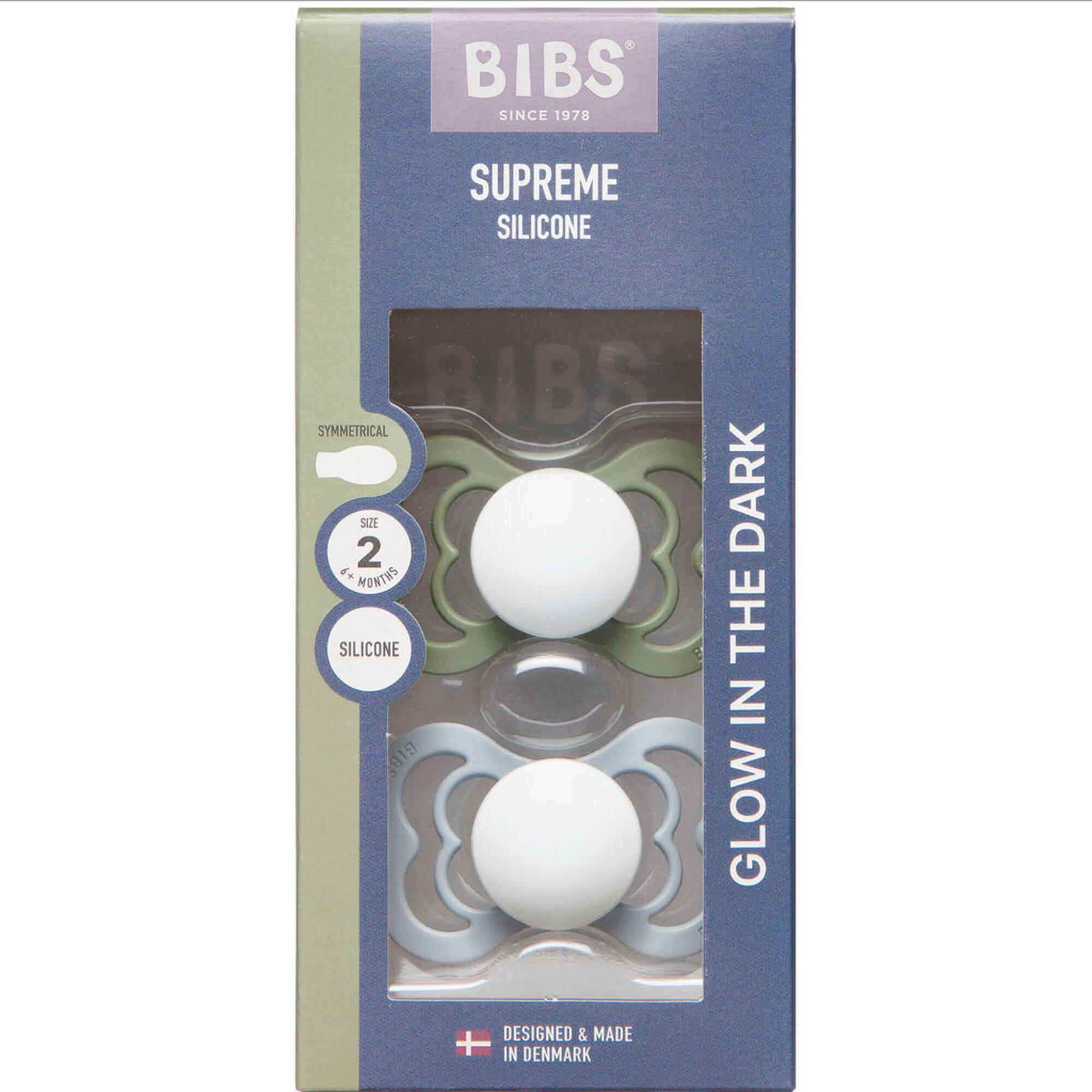Køb BIBS Supreme Silicone Glow Sut Str. 2, Sage Glow/Cloud Glow, Symetrisk 2 stk. online på apotekeren.dk og få varen tilsendt direkte til dig.