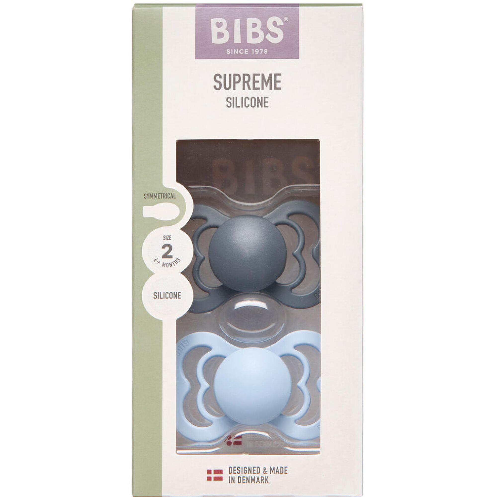 Køb BIBS Supreme Silicone Sut Str. 2, Iron/Baby Blue, Symetrisk 2 stk. online på apotekeren.dk og få varen tilsendt direkte til dig.