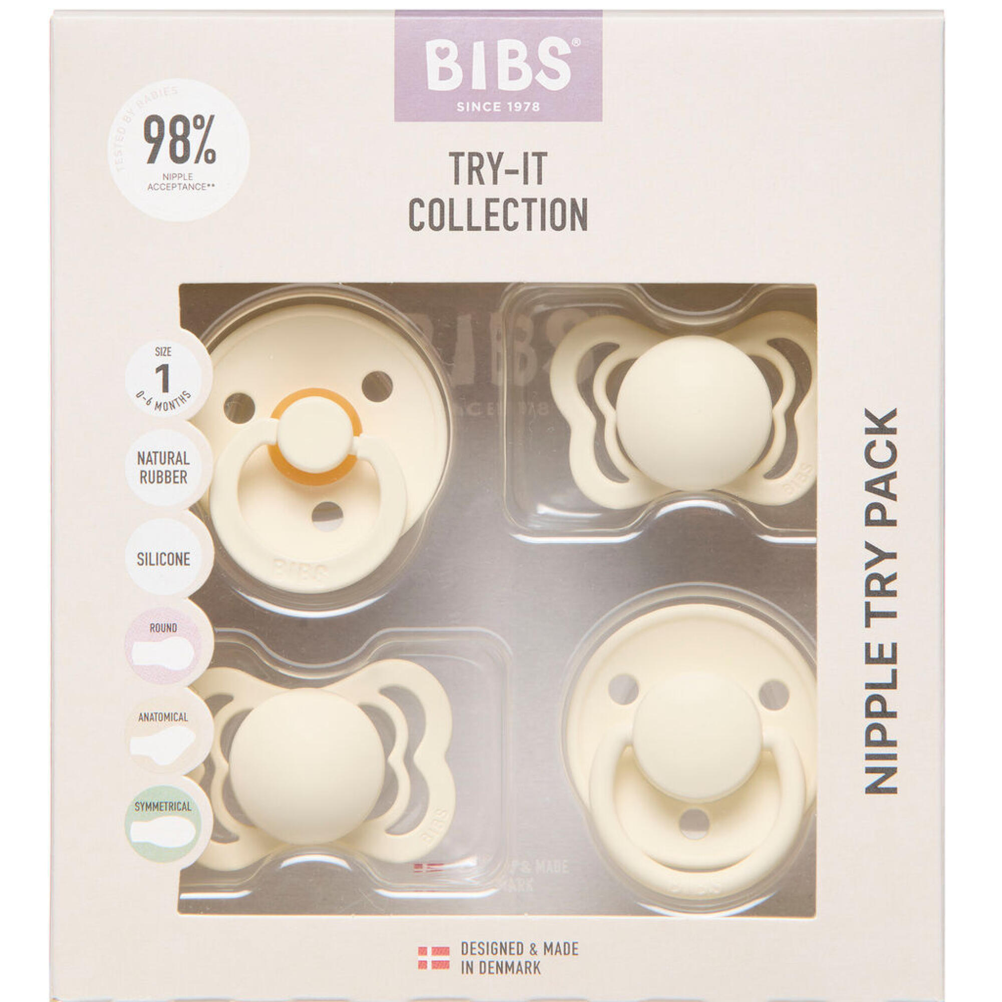 BIBS Try-It Collection Str. 1 er en sampak med fire forskellige sutter. Alle børn har forskellige ansigtstræk, suttepræferencer og mundudvikling, så nogle sutter er simpelthen bedre end andre. I denne praktiske sampak får du fire forskellige skjoldstile, tre nippleformer og to materialer at eksperimentere med. Alle skjold har ventilationshuller, der forhindrer fugtopbygning. Designet og fremstillet i Danmark.