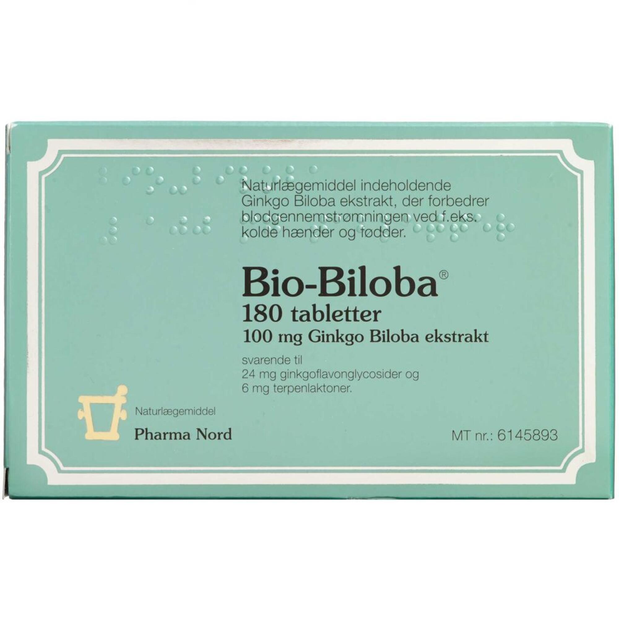 Bio-Biloga (ekstrakt af Ginkgo Biloba), pakningsstørrelse 90/180 stk. Læs omhyggeligt indlægssedlen. Indikationer: Naturlægemiddel ved længerevarende symptomer på hukommelsesbesvær, koncentrationsbevær, træthed, svimmelhed og øresusen hos ældre mennesker, hvor læge har udelukket anden tilgrundliggende sygdom. Naturlægemiddel ved tendens til kolde hænder og fødder samt ved gangudløste smerter i benene som følge af dårlig blodforsyning (claudication intermittens). Dosering: Voksne: 1-2 tabletter dagligt. Bio-Biloba bør ikke anvendes til børn under 12 år uden lægens anvisning. Kontraindikationer: Må ikke anvendes til gravide eller ved overfølsomhed over for Ginkgo Biloba eller en eller flere af hjælpestofferne. Særlige advarsler og forsigtighedsregler vedrørende brugen: Patienter med patologisk øget risiko for blødning, epileptikere, østrogenreceptorpositiv brystkræft, transplanterede, behandling med beta-blokkere, efavirenx samt patienter med nedsat lever- eller nyrefunktion bør udvise forsigtighed. Interaktion: Følgende produkter kan give interaktion: Antiepileptika, NSAID, Orale antikoagulantia, Trombininhibitorer, Calciumantagonister, Betablokkere, Statiner, Protonpumpehæmmere, antidiabetika (Sulfonamider), Antivirale lægemidler. Læs mere om dette og bivirkninger på produktresuméet.