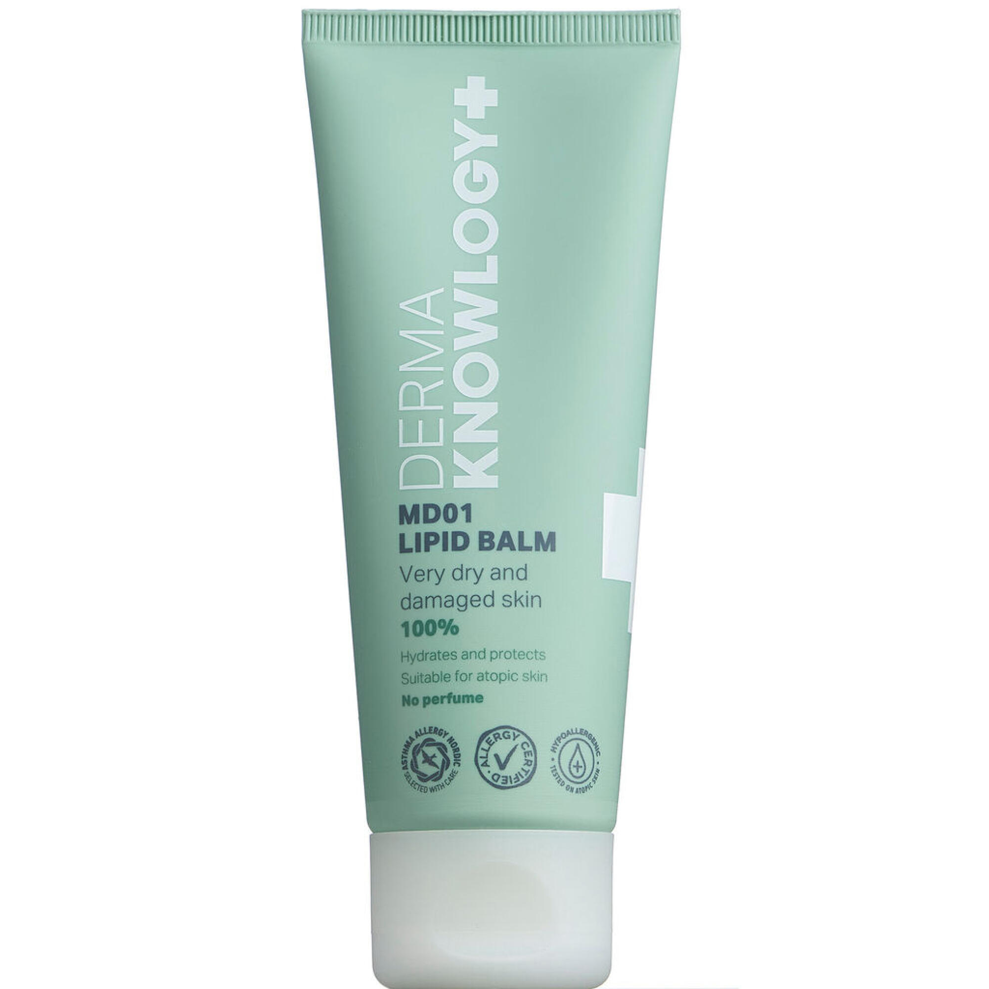 Derma Knowlogy+ MD01 Lipid Balm består af 100% fedt, men er formuleret, så den absorberes hurtigere end lignende cremer. Cremen kan med fordel anvendes til irriteret og sart hud. Den er desuden nyttig under kolde vejrforhold til udsat hud såsom læber og fingerspidser. Derma Knowlogy+ MD01 Lipid Balm er anbefalet af Allergy- Certified og Asthma Allergy Nordic. Den er uden parfume og farvestoffer og minimerer derved risikoen for reaktioner og hudirritationer.