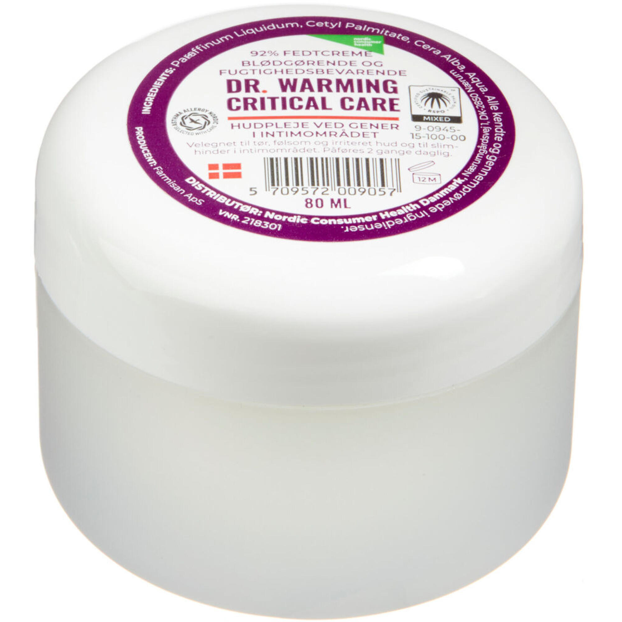 Dr.Warming Critical Care er en fedtcreme mod vulvalidelser. Cremen har et højt fedtindhold på 92% og smelter umiddelbart efter påsmøring på tempereret hud. Cremen er derfor let at fordele og yderst behagelig at anvende. Det høje fedtindhold virker som en kappe, der holder fugtigheden i området.