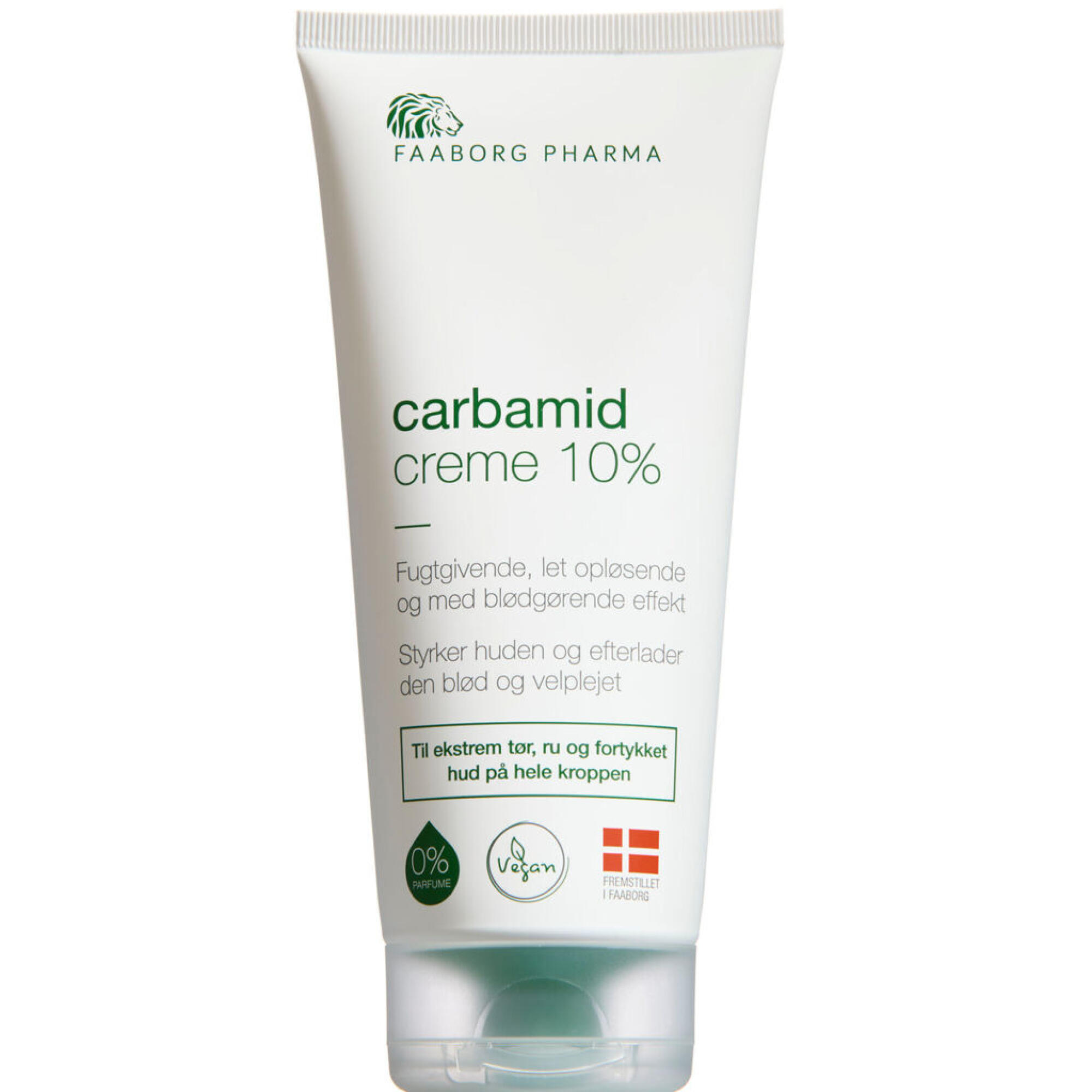 Carbamid creme 10% (22% fedtindhold) er en fugtbindende og styrkende creme til ekstrem tør, ru og fortykket hud på krop og fødder. Den plejende creme trænger hurtigt ind og medvirker til at binde fugtigheden i din hud. Indholdet af carbamid, også kaldet urea, som er et af kroppens egne naturlige stoffer, virker opblødende på den hårde og tørre hud.