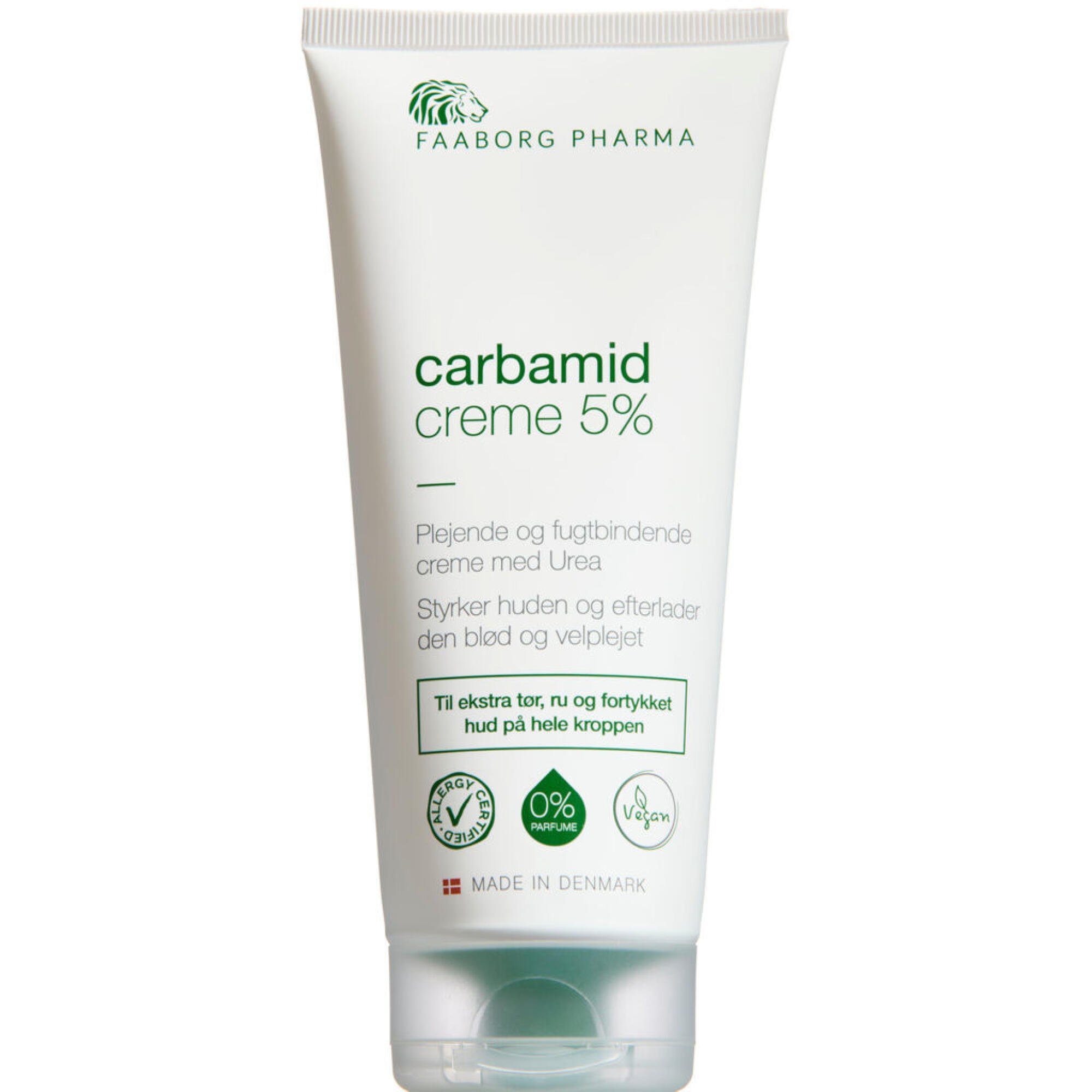 Carbamid creme 5% (22% fedtindhold) er en meget fugtaktiv creme, specielt velegnet til ekstra tør og ru hud på hele kroppen. Den plejende creme trænger hurtigt ind og medvirker til at binde fugtigheden i din hud. Indholdet af carbamid, også kaldet urea, som er et af kroppens egne naturlige stoffer, virker opblødende på den hårde og tørre hud.