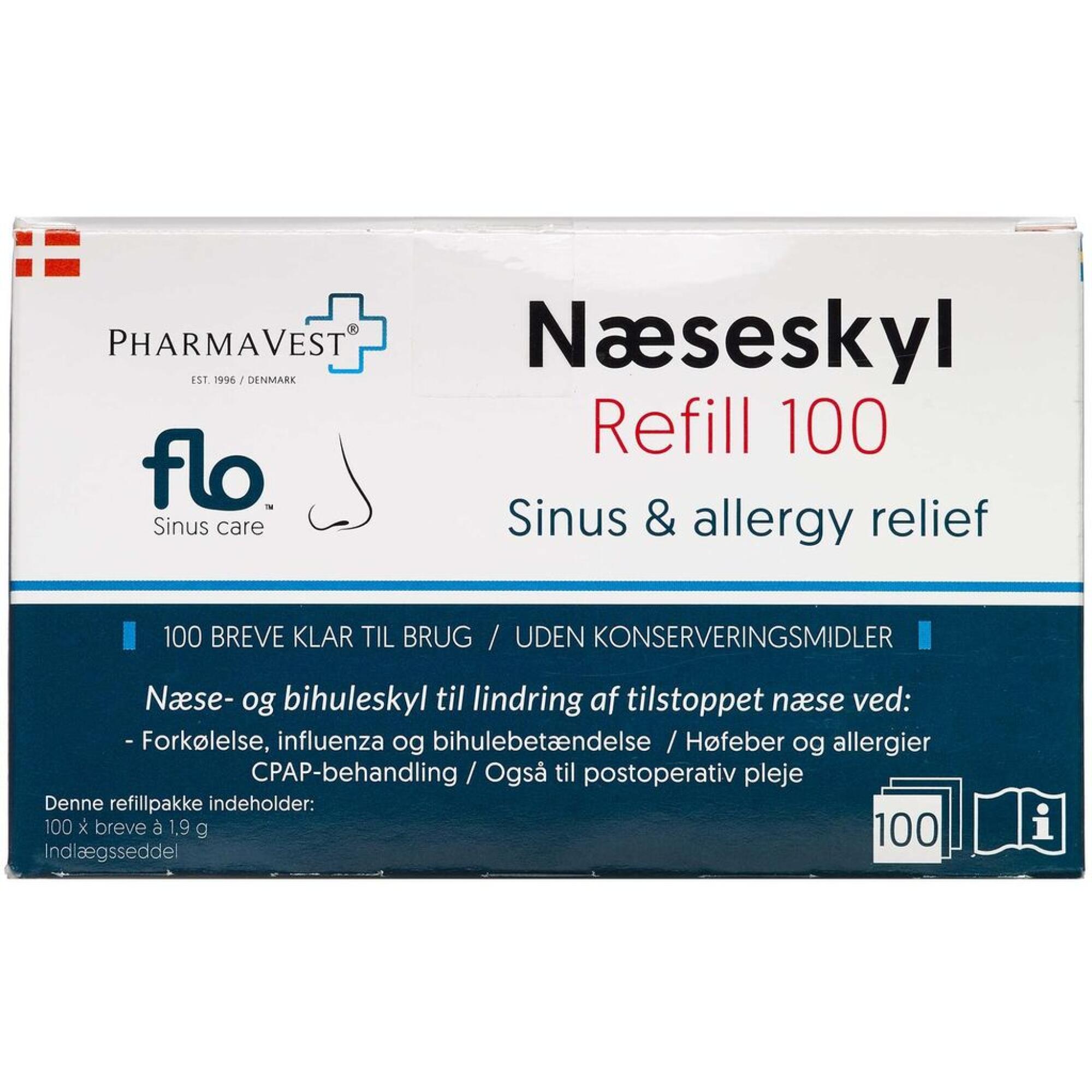 FLO Næseskyl Refill anvendes sammen med FLO Sinus Care skylleflasken, som findes i FLO Næseskyl Startersæt.