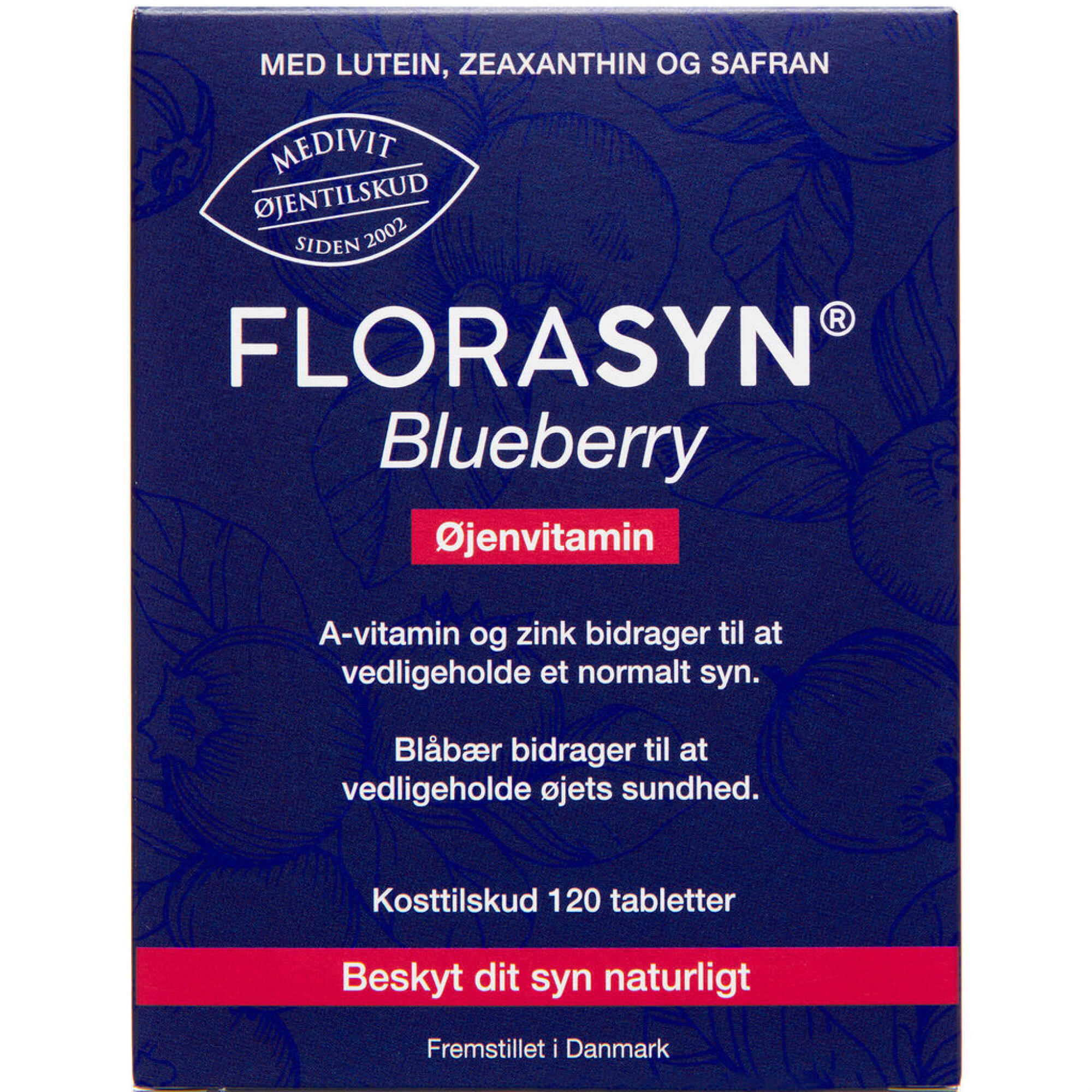Florasyn Blueberry kombinerer relevante og innovative plantestoffer som blåbær, lutein, zeaxanthin og safran med zink og a-vitamin. Tilsammen giver det et unikt kosttilskud, som beskytter synet mod alderspåvirkninger af nethinden. Blåbær bidrager til at vedligeholde øjets sundhed og hjælper til at forbedre natteblindhed. Zink og a-vitamin bidrager til at vedligeholde et normalt syn.