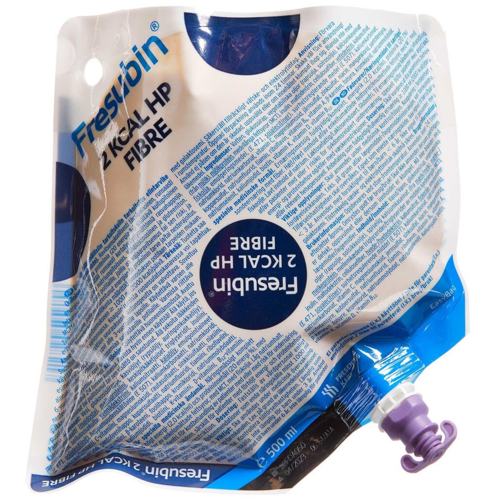 Fresubin 2 kcal HP Fibre er en fuldgyldig, energirig, proteinrig sondeernæring med fibre. Til ernæringsbehandling af patienter med højt energibehov og/eller væskerestriktion og samtidig konstateret underernæring eller med eller i risiko for underernæring.