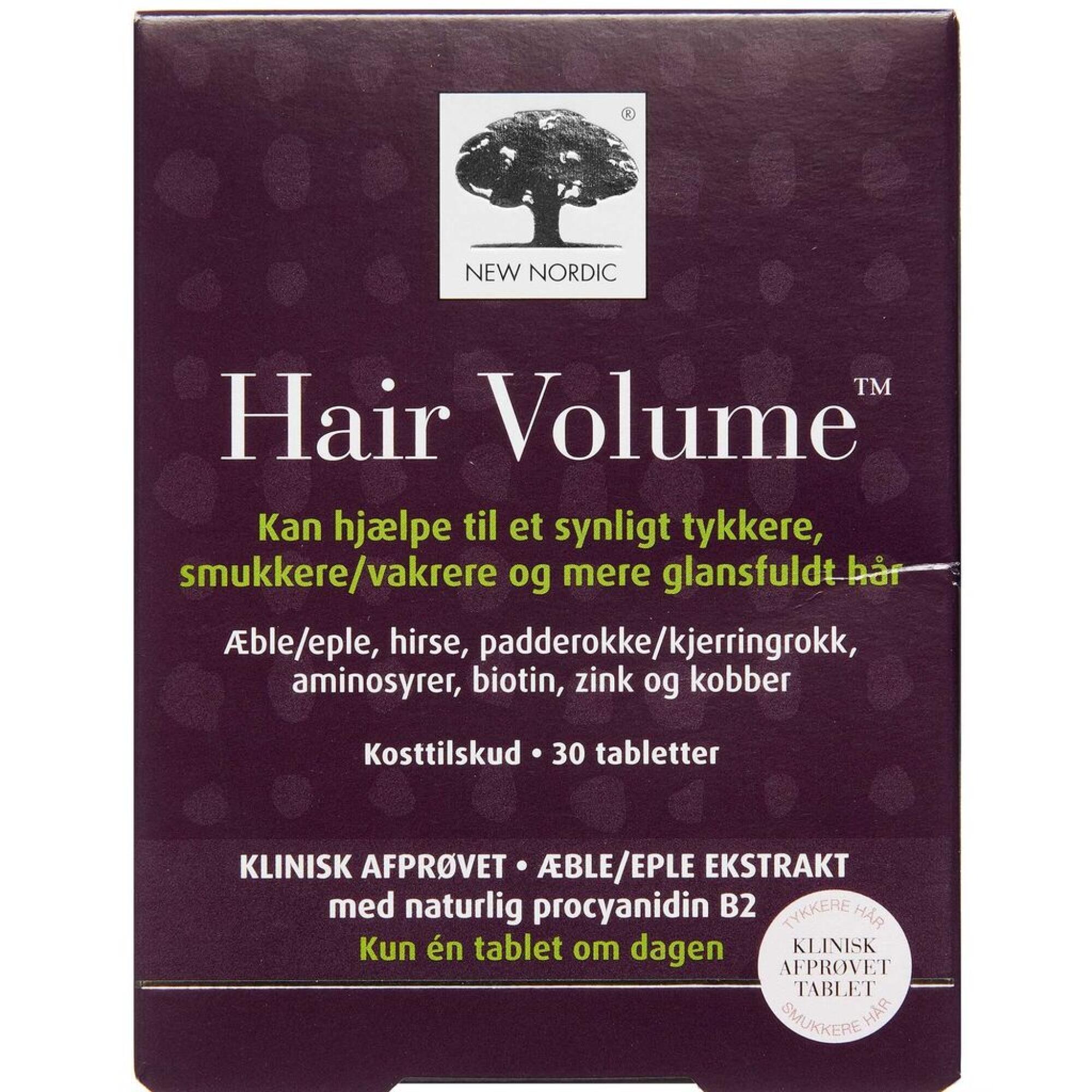 Hair Volume er en tablet af æble ekstrakt i kombination med hirse, padderokke, aminosyrer, biotin, zink og kobber.