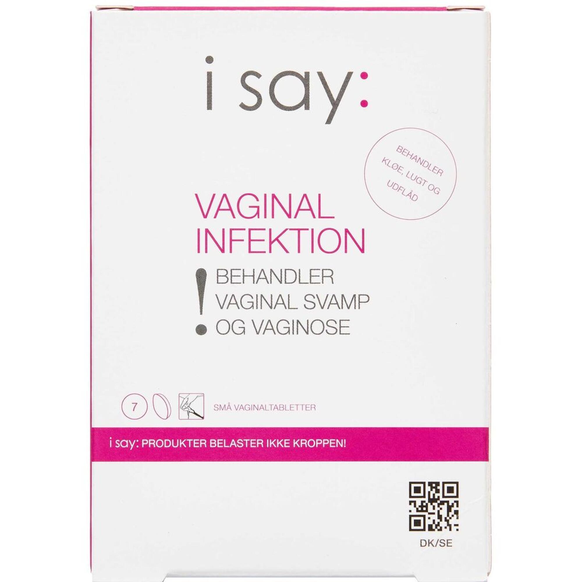 i say: Vaginal infektion giver naturlig behandling og forebyggelse af både vaginale svampe og bakterielle infektioner (vaginose). Behandling og forebyggelse af ubehag som udflåd, lugt og brændende fornemmelse. Genopretter og vedligeholder normal pH-niveau i vagina (pH 3,8-4,5).
