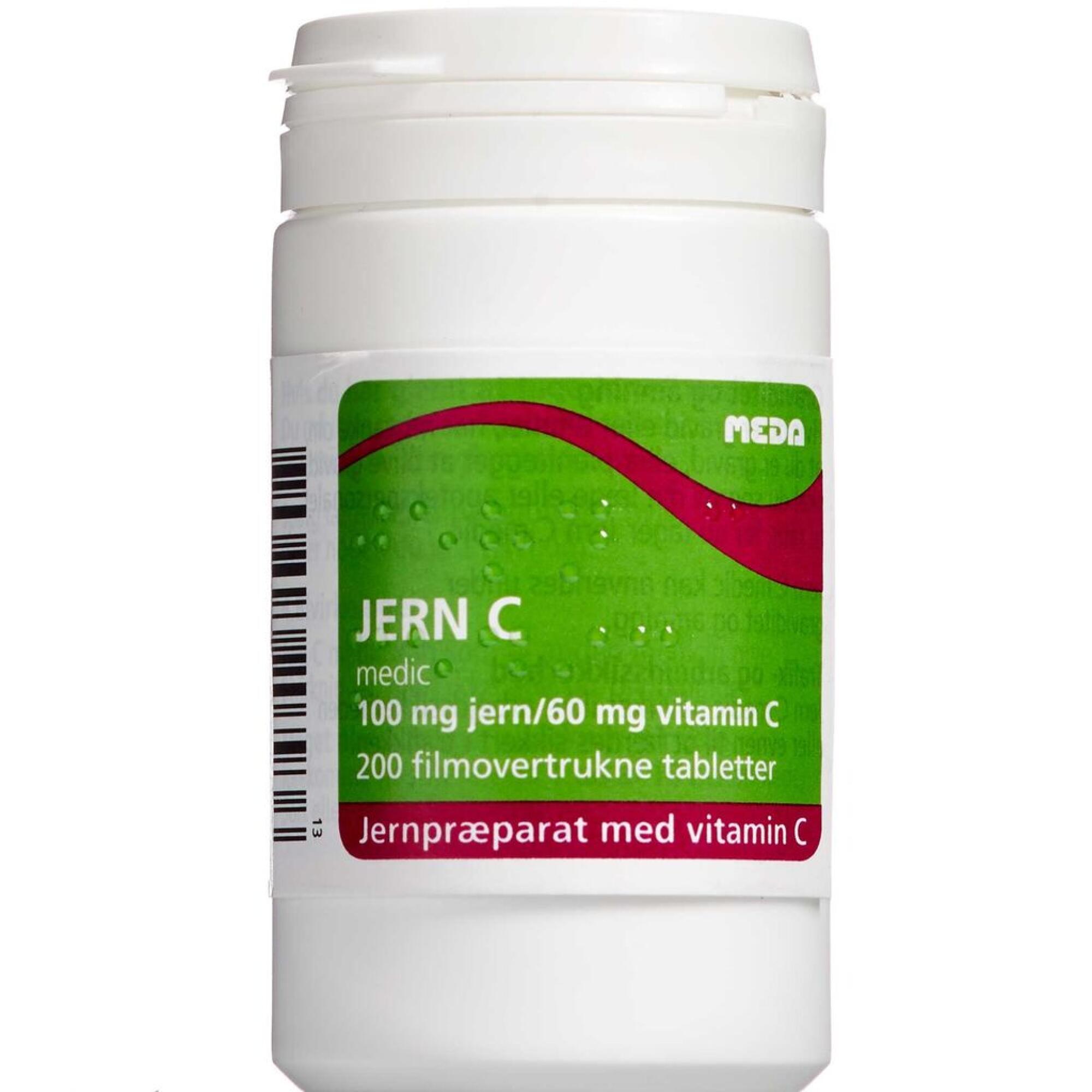Jern C "medic" (Ferrofumarat). Pakningsstørrelse 100 stk./200 stk./ 100x10 stk. Læs omhyggeligt indlægssedlen. Indikation: Forebyggelse og behandling af jernmangel. Dosering: Forebyggende: Dosering voksne: 1 tablet daglig. Behandling: Dosering voksne: 1 tablet op til 3 gange daglig. Bør ikke indtages i forbindelse med et måltid. Bør ikke anvendes til børn under 12 år uden lægens anvisning. Kontraindikationer: Overfølsomhed over for de aktive stoffer eller et eller flere af hjælpestofferne. På grund af jernindholdet må Jern C "Medic" ikke anvendes ved følgende tilstande: Tilstande med forhøjet mængde røde blodlegemer (polycytæmi (erytrocytose)) og tilstande med forhøjede jerndepoter (hemosiderose, hæmocromatose). Anæmiske tilstande, der ikke karakteriseres ved jernmangel (f.eks. hæmolytisk anæmi eller thalassæmi). Porfyia cutanea tarda (kan skyldes hepatisk akkumulering af jern). Samtidig indgift af antidoten dimercaprol. Særlige advarsler og forsigtighedsregler vedrørende brugen: Jern C "medic" bør anvendes med forsigtighed ved: Alkoholisme, inflammatoriske tarmsygdomme (morbus crohn, enteritis, colitis, diverticulitis, colitis ulcera, peptisk ulcus), da jerntilskud kan forværre sygdommens symptomer, ved gentagne blodtransfusioner (da det høje jernindhold i erythrocytterne kan medføre jern-overload). Afføringen farves sort af jerntilskud. Da afføring også kan farves sort som følge af blødning i mave-tarnkanalen, vanskeliggøres observation for en sådan blødning af samtidig jerntilskud. Falsk positiv reaktion på undersøgelse af afføring for blod ses ved visse metoder. Jerntilskud bør ikke fortsættes ud over 6 måneder uden lægelig vejledning. Interaktion: Antacida, Protonpumpehæmmere og H2-blokkere, øvrige mineraler, Ace-hæmmere, methyldopa, antikoagulantionsbehandling, quinoloner, tetracykliner, acetohydroxam syre, etidronat, penicillamin, antiparkinson midler, disulfiram, mycophenolsyre, levothyroxin, dimercaprol samt følgende fødevarer: Mælk, mælkeprodukter, kaffe, æg, fødevarer med høj indhold af bicarbonat, carbonat, oxalat eller fosfat, te med megen garvesyre, grovbrød, cerealier og kostfibre.