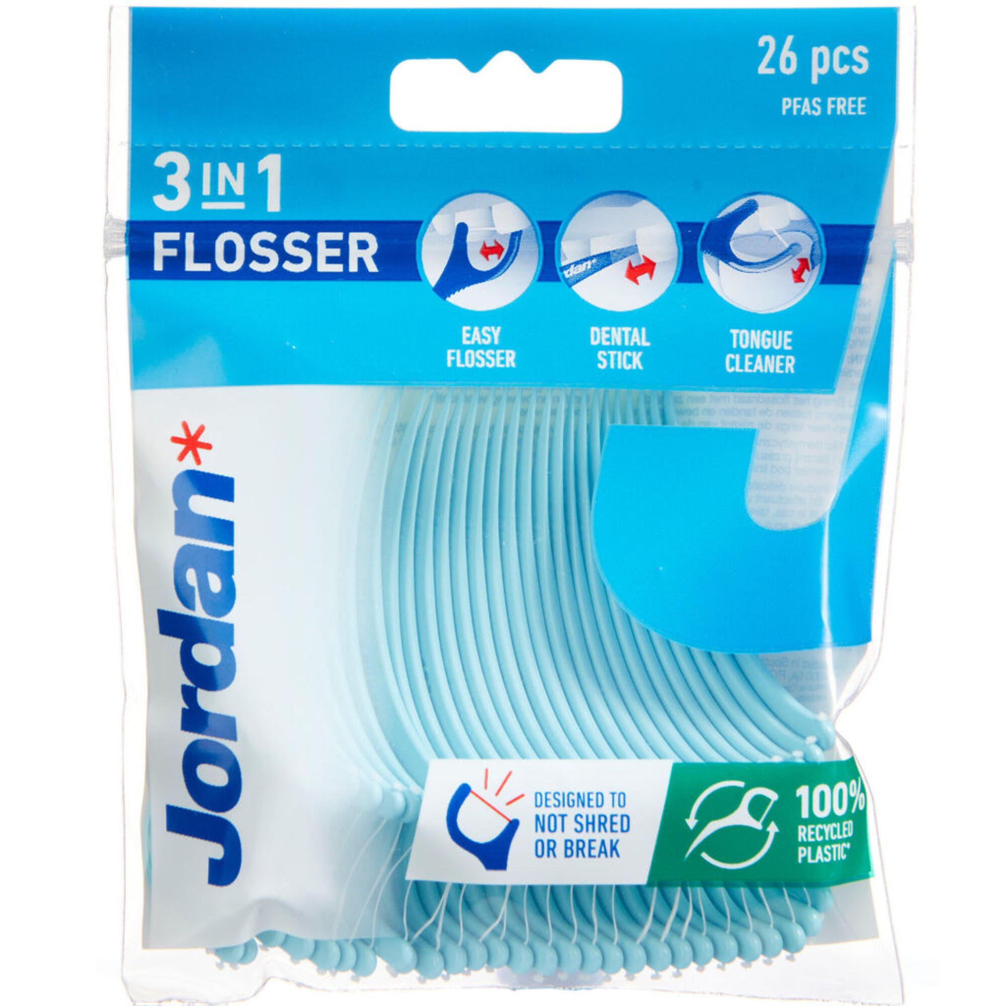 Jordan 3-i-1 flosser er en praktisk og brugervenligt tandstik med tandtråd, lavet af 50% genanvendt plastik. Den er PFAS fri og selve flosseren er tilsat flour.