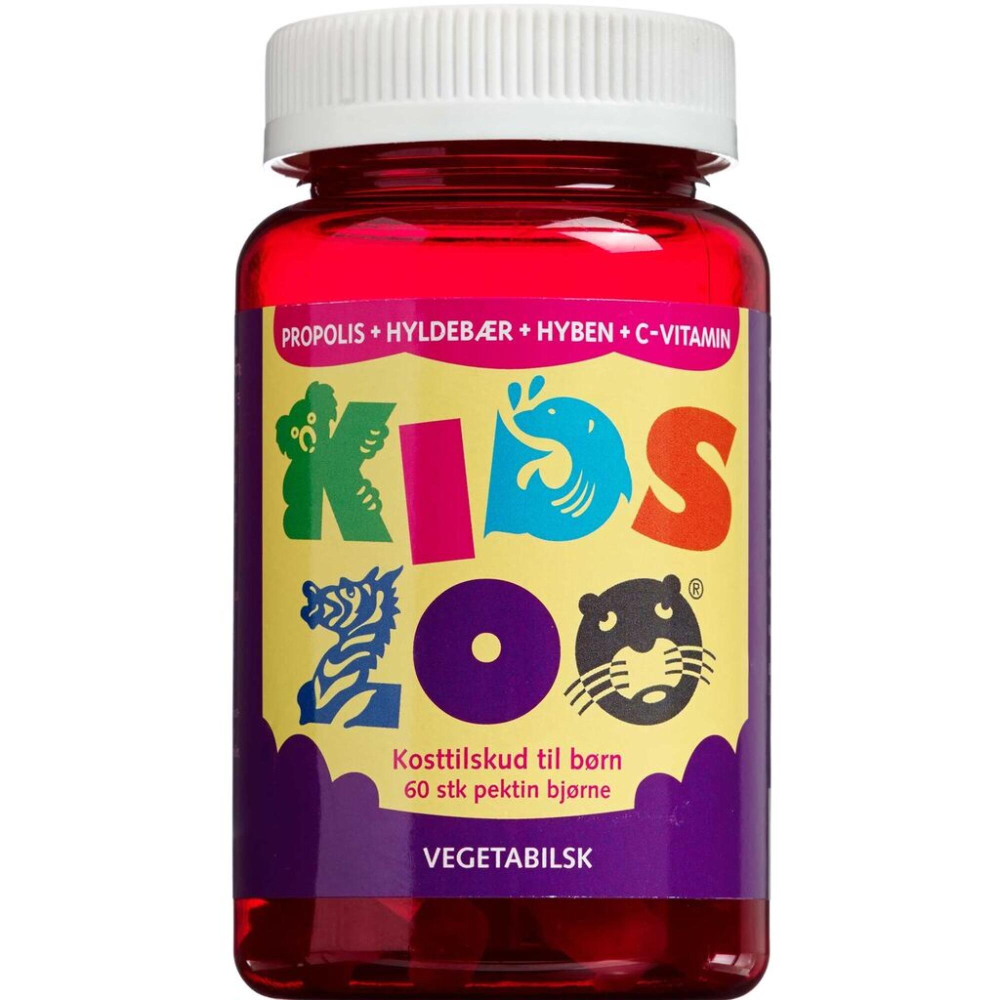 Kids Zoo Vegetabilsk Kosttilskud med propolis, hyldebær, hyben og c-vitamin er et kosttilskud til børn fra 3 år og op. Kids Zoo Vegetabilsk Kosttilskud med propolis indeholder også Vitamin C som bidrager til vedligeholdelse af immunsystemet samt dannelsen af kollagen, der har betydning for normalt fungerende knogler, tænder, tandkød og hud.