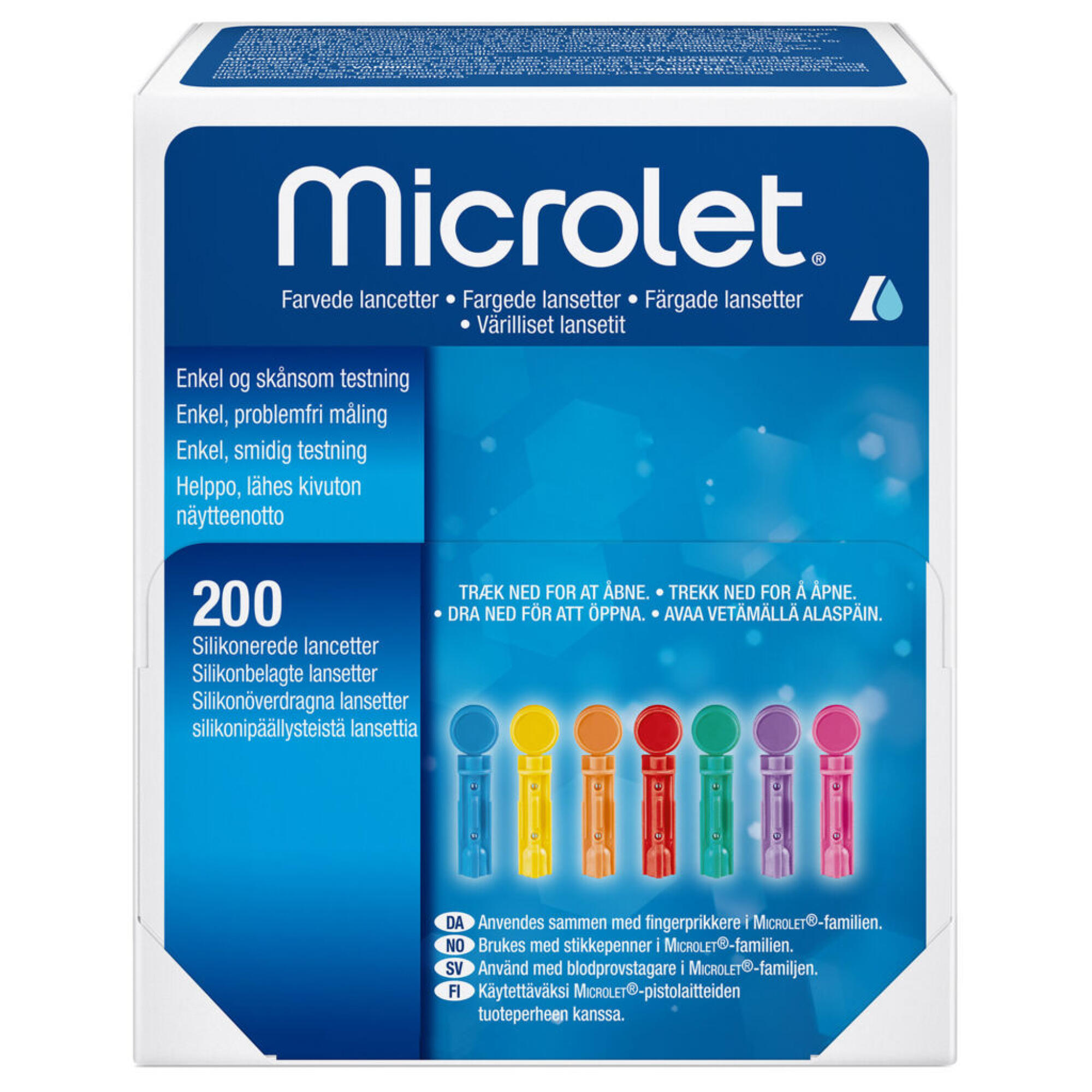 Microlet lancetterne kommer i pakker på 200 stk. med syv forskellige farver. Lancetterne er beregnet til engangsbrug, og det anbefales at skifte lancetten efter hver blodprøve. De forskellige farver kan hjælpe dig med at huske at skifte lancetten hver gang. Lancetterne anvendes sammen med Micorlet Next fingerprikker.