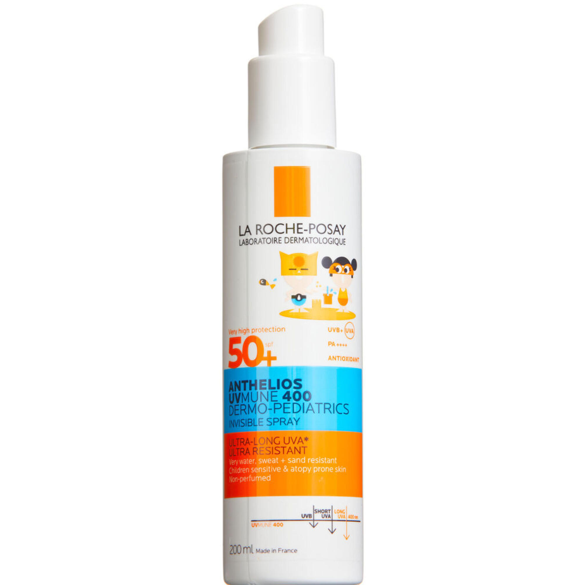 La Roche-Posay Anthelios Uvmune 400 Kids Invisible Spray SPF50+ giver en meget høj beskyttelse og beskyttelse mod ultralange UVA-stråler til krop og ansigt. Ekstra vandresistent samt sved og sandresistent.