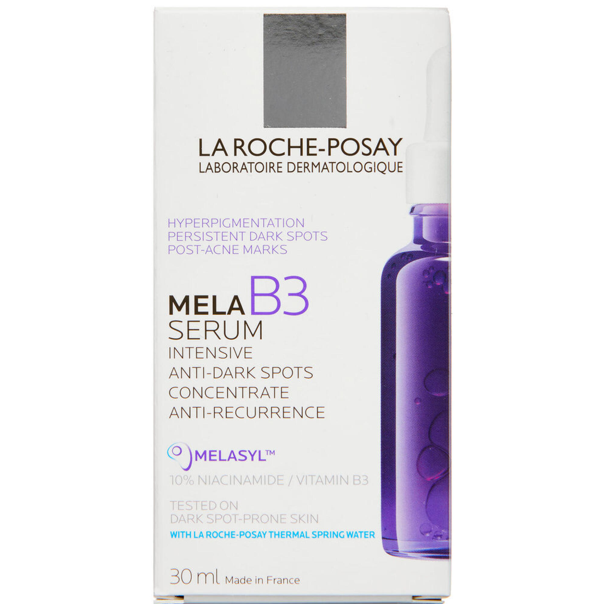 La Roche Posay Melab3 Serum med 10% niacinamid, hyaluronsyre og MELASYL som fugter og bekæmper synligheden af pigmentpletter / mørke pletter på huden. Huden fremstår yngre med en jævnere hudtone og synligt reducere pigmentpletter. Udviklet for optimal tolerance til enhver hudtype. Modvirker tilbagevendende mørke pletter.