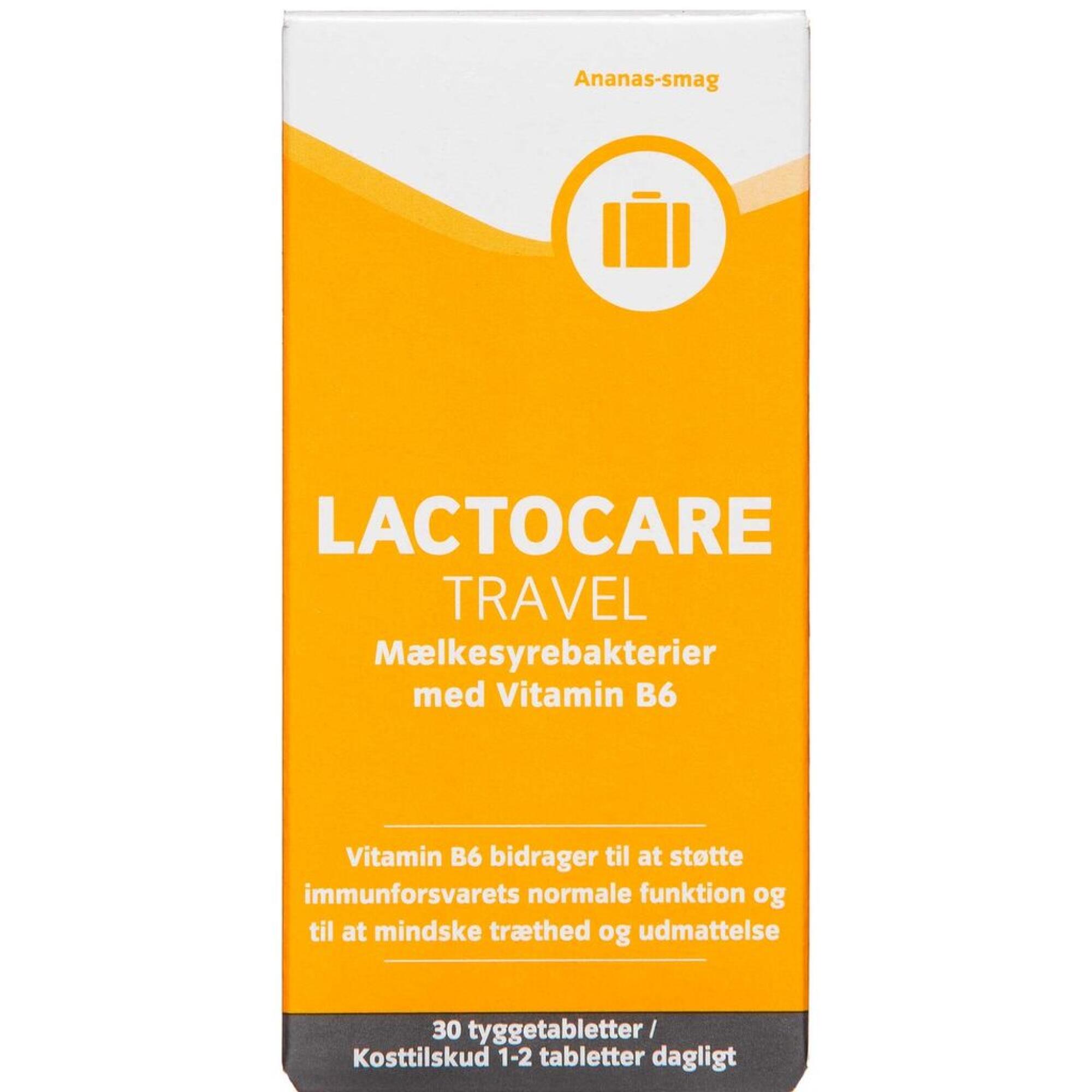 Lactocare Travel er et kosttilskud med mælkesyrebakterier og vitamin B6.