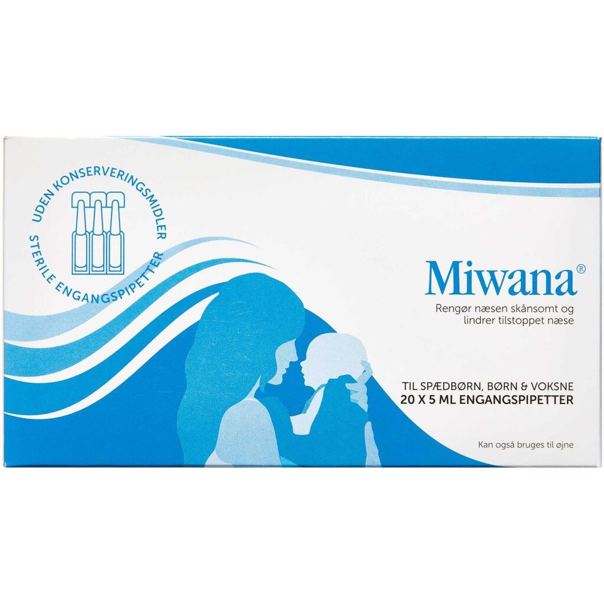 Miwana Næsedråber er steril opløsning i engangspipetter, som er beregnet til daglig rensning af næse og øjne hos spædbørn, børn og voksne. Miwana Næsedråber gør det lettere at fjerne slim i næsen hos spædbørn og mindre børn. Produktet hjælper også med at fjerne sekret samt fugter og mindsker tørhed i næsen hos voksne.
