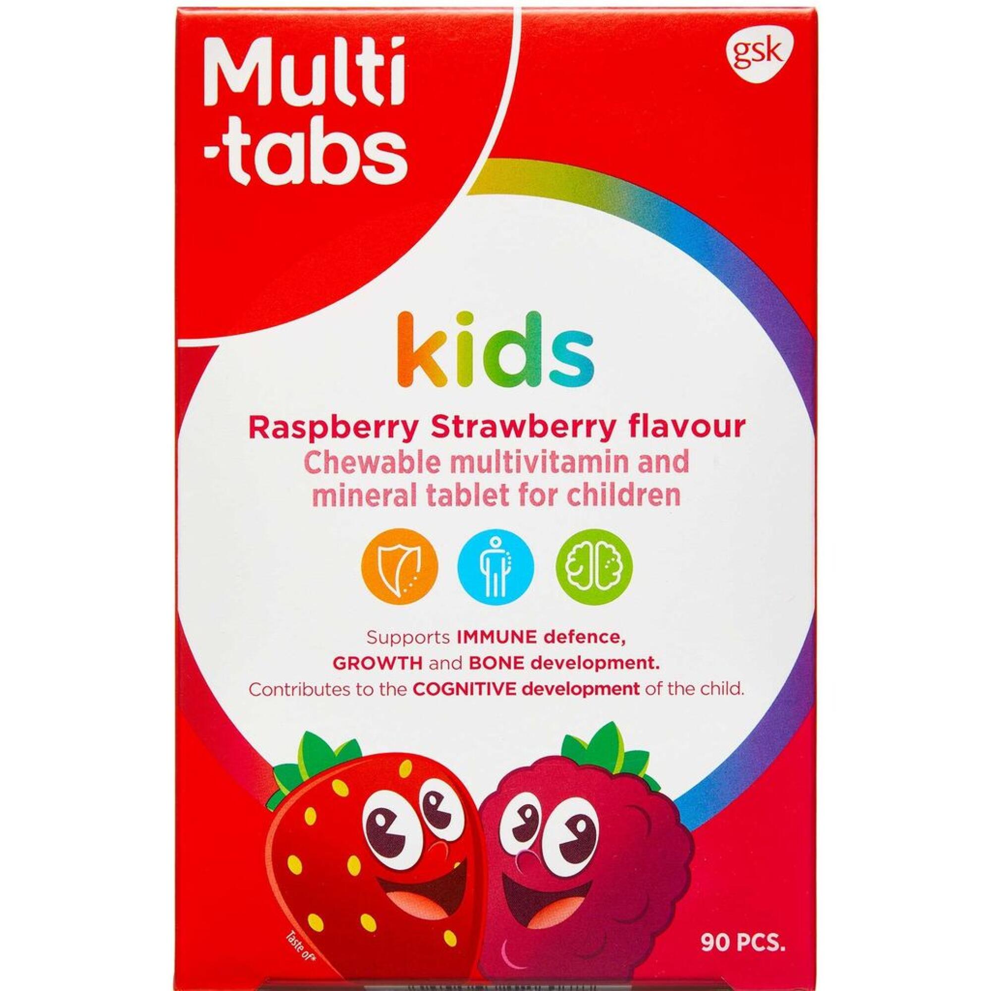 Multi-tabs Kids hindbær/jordbær er kosttilskud, der består af tyggetabletter med multivitaminer, med smag af hindbær og jordbær til børn fra 3 år. Produktet indeholder bl.a. Vitamin C og D, som beskytter barnets immunssystem samt Vitamin D som hjælper barnets vækst og knogleudvikling.