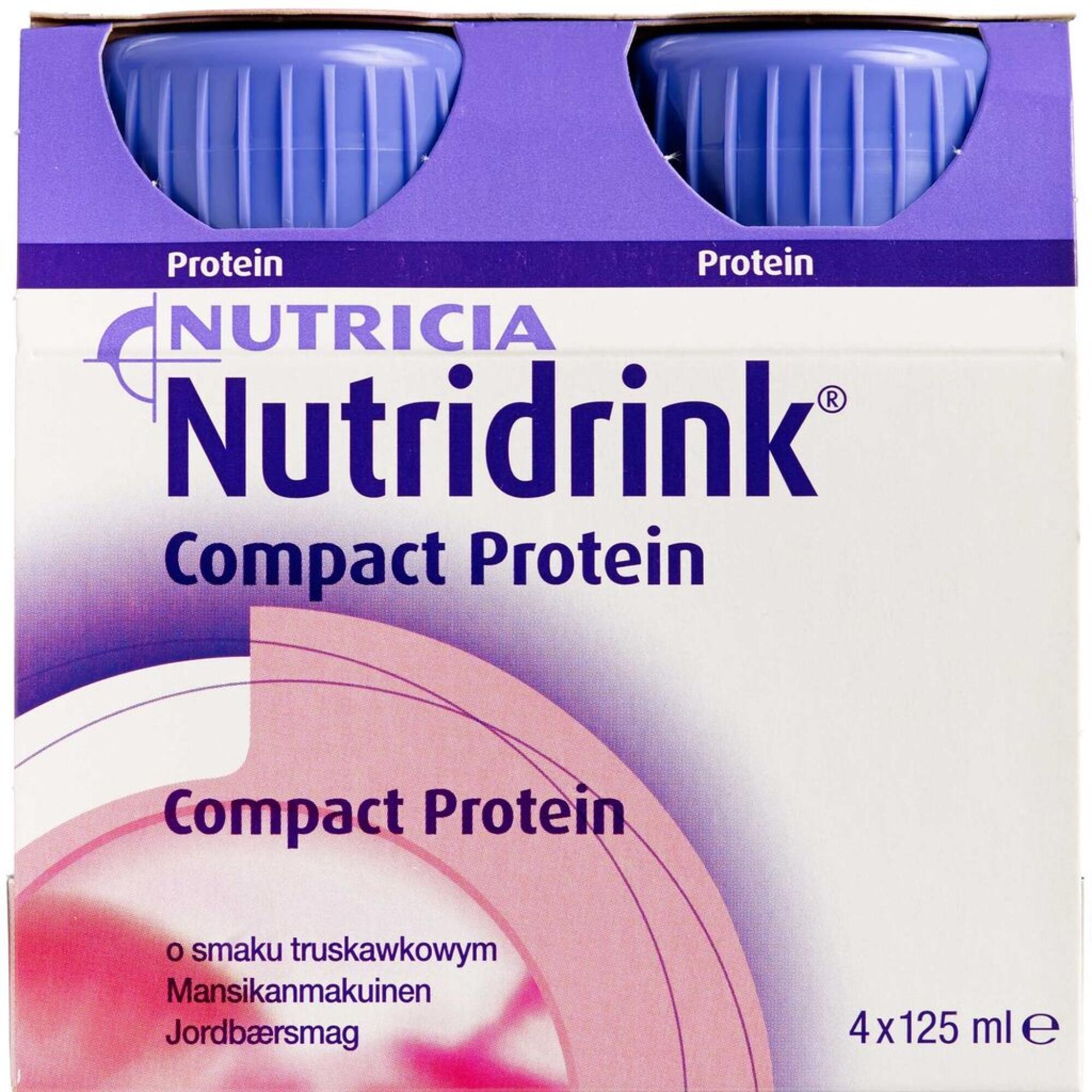 Nutridrink Compact Protein er en supplerende ernæringsdrik med en energitæthed på 2,4 kcal/ml og et højt proteinindhold på 0,14 g/ml (24E%).
