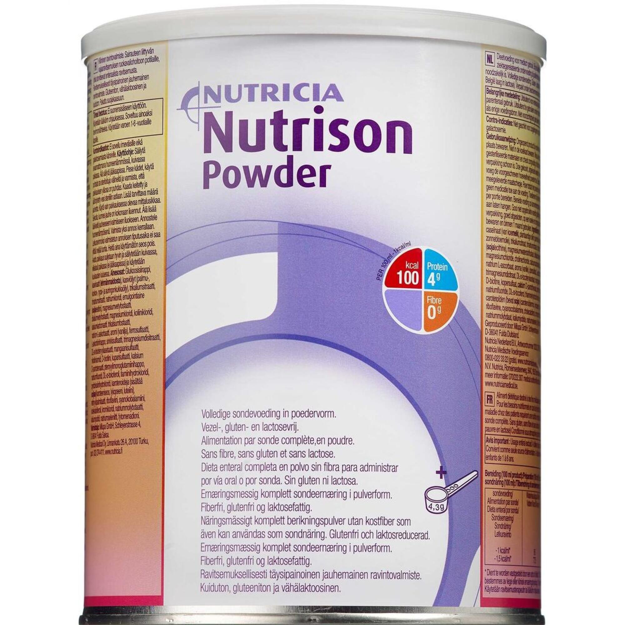 Nutrison Powder er fuldgyldig sondeernæring eller berigelsespulver, som kan anvendes til at øge madens energi- og næringsindhold.