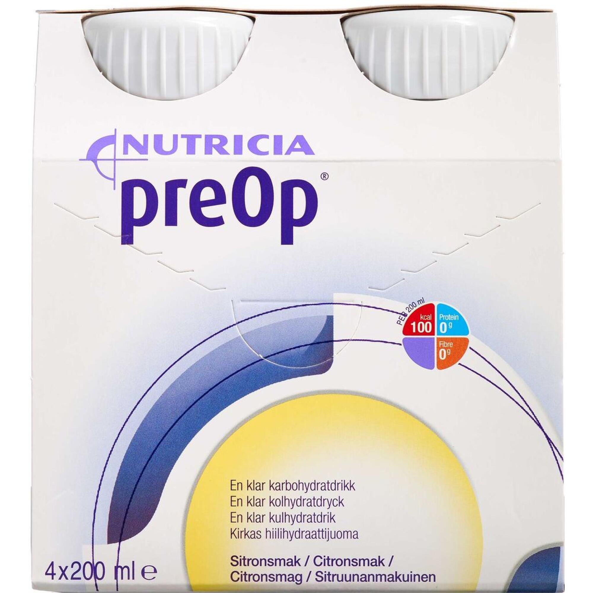 PreOp er en klar, kulhydratdrik til præoperativ behandling af kirurgiske patienter. Den en fedtfri, glutenfri og laktosefri.