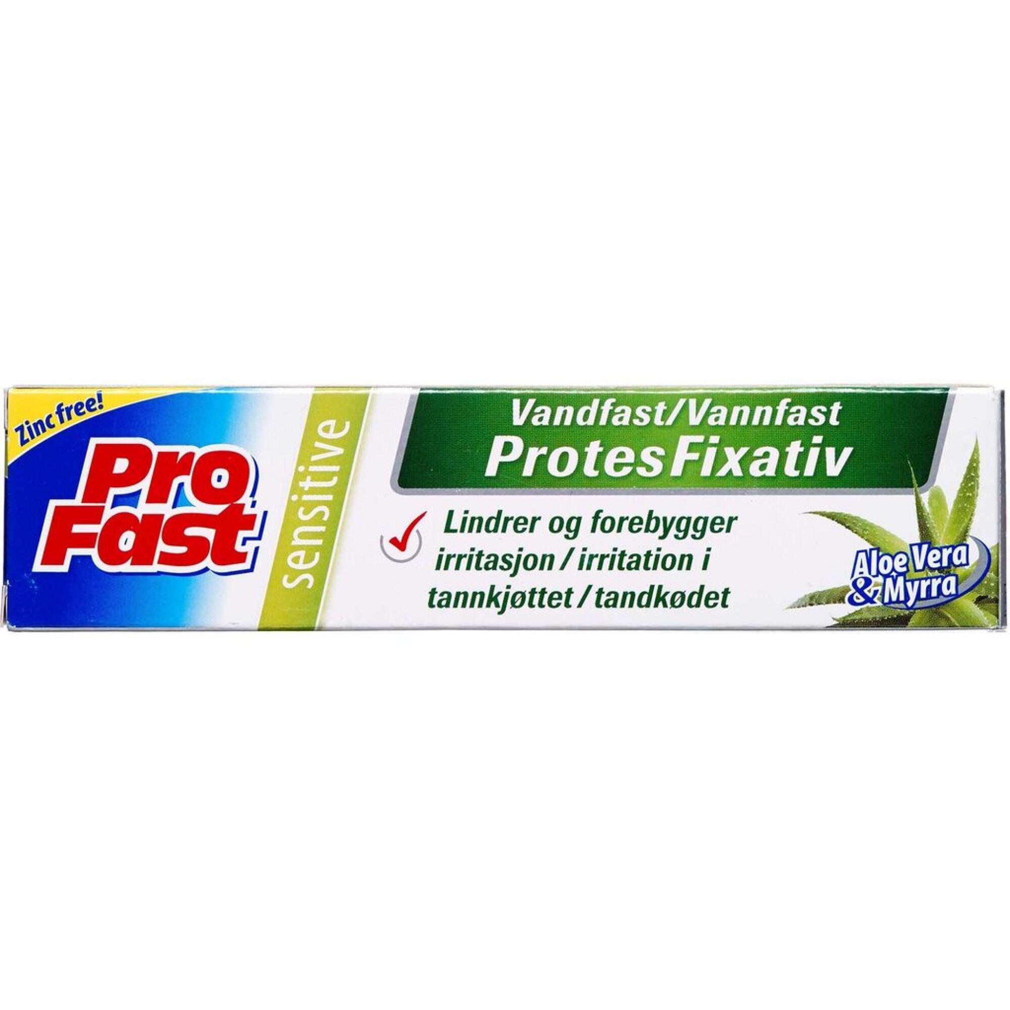 Profast Sensitiv Protesefixativ lindrer og forebygger tandkødsirritationer og virker med op til 12 timers fixering. Produktet er specielt udviklet til personer med følsomt tandkød.