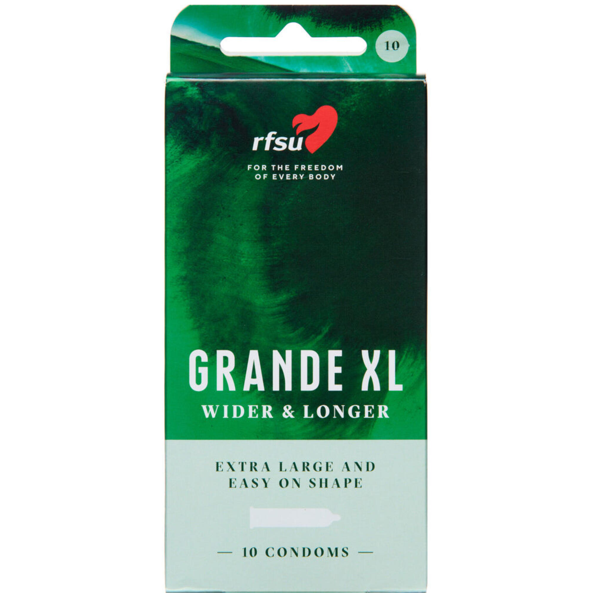 RFSU Grande XL - Ekstra stort kondom for optimal pasform. Grande XL er et ekstra rummeligt kondom med en ekstra generøs form, der giver den bedste pasform og følelse. Velegnet til dem, der finder standardkondomer for korte eller for stramme. Et kondom med lige pasform (easy-on), der gør kondomet nemmere at rulle på. Kondomet har en beholder i toppen, er ufarvet og glat med ekstra glidecreme (silikone). Kondomer er det eneste præventionsmiddel, der beskytter mod både graviditet og seksuelt overførte sygdomme og er fuldstændig hormonfrit. Ingen prævention er 100 % sikker. Hvis et kondom lækker eller går i stykker under sex, skal du kontakte en apoteker eller læge så hurtigt som muligt og inden for 72 timer.