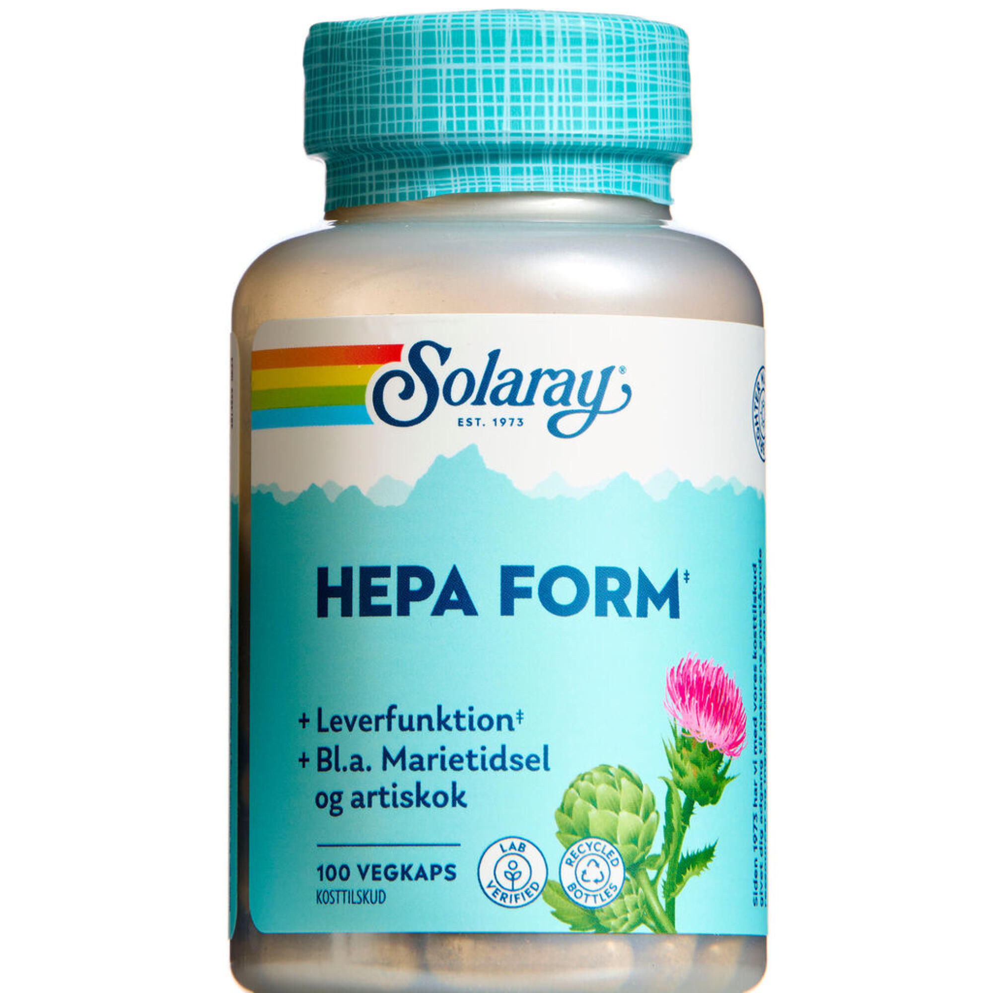 Solaray Hepa Form er et urteprodukt med mælkebøtte, marietidsel og artiskok.