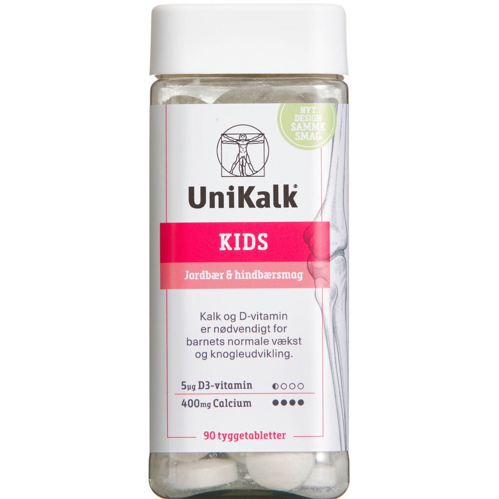 UniKalk Kids Jordbær med 400 mg Calcium og 5 mikg D3-vitamin. Tyggetablet med jordbær/hindbærsmag. Godt for din knoglesundhed.