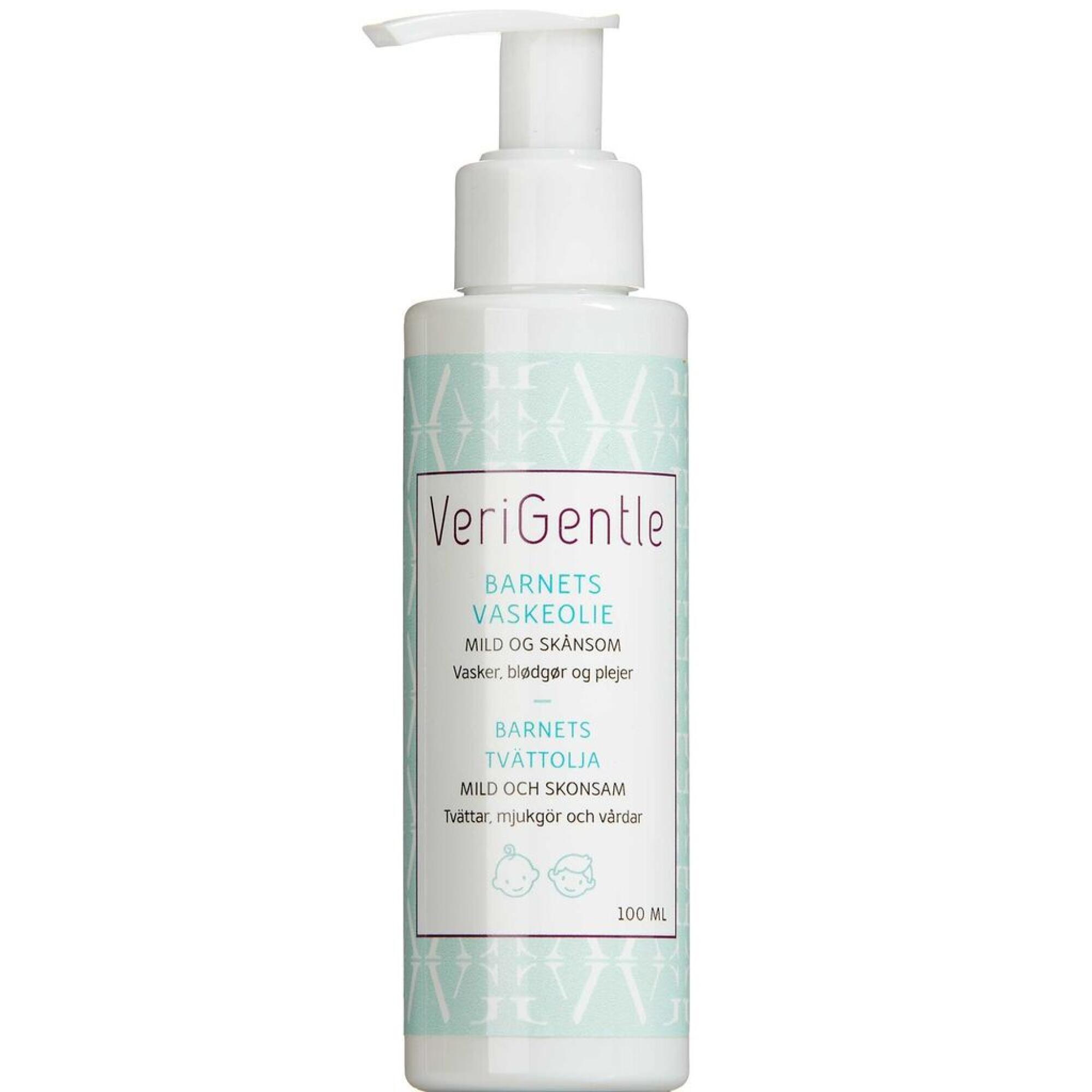 Verigentle Barnets Vaskeolie indeholder hverken sæbe eller vand og udtørrer derfor ikke barnets følsomme hud.