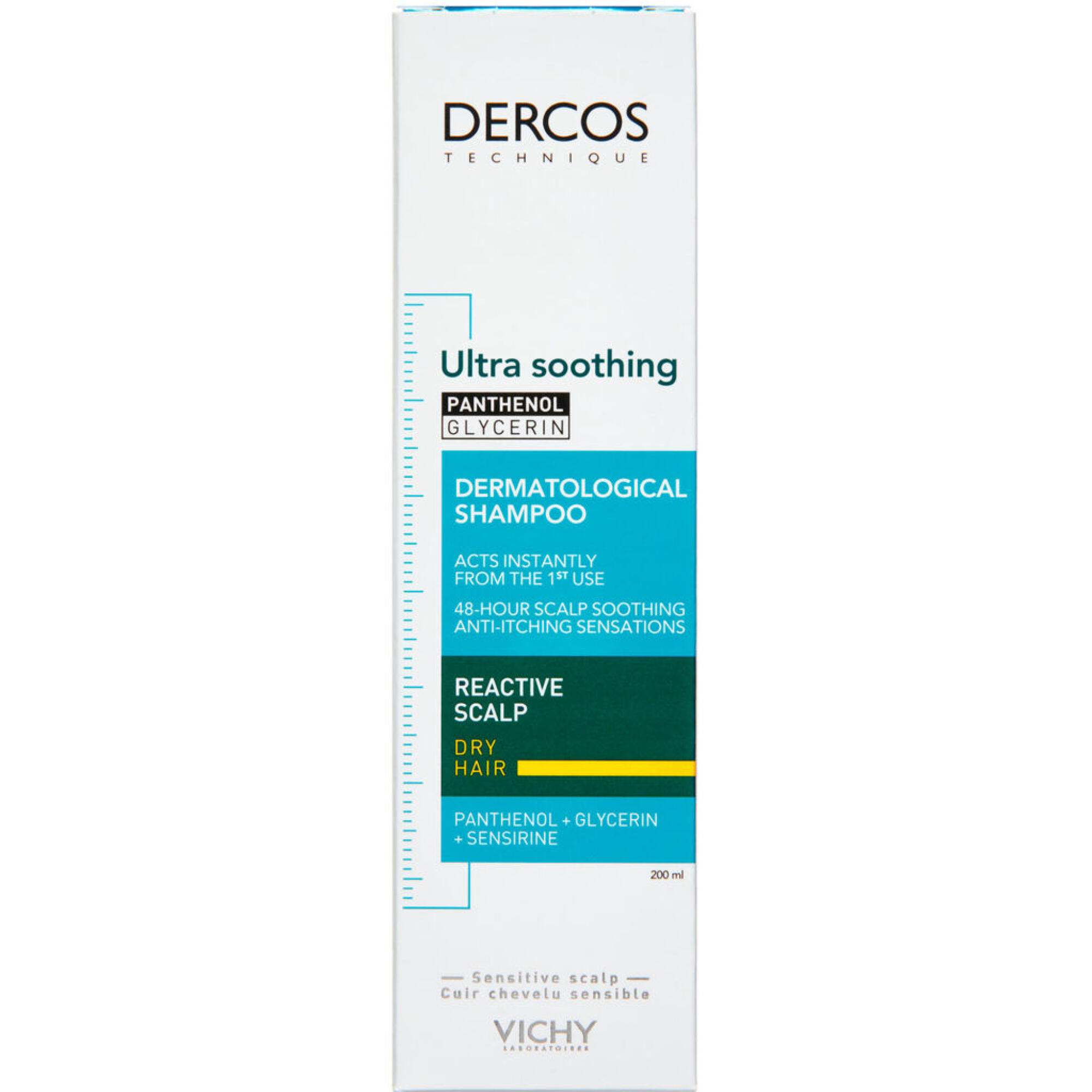 Vichy Dercos Ultra Soothing Shampoo Dry Hair har en dokumenteret effekt på hovedbunden. Indeholder SENSIRINE aktivt kompleks, glycerin og panthenol for optimal effektivitet.