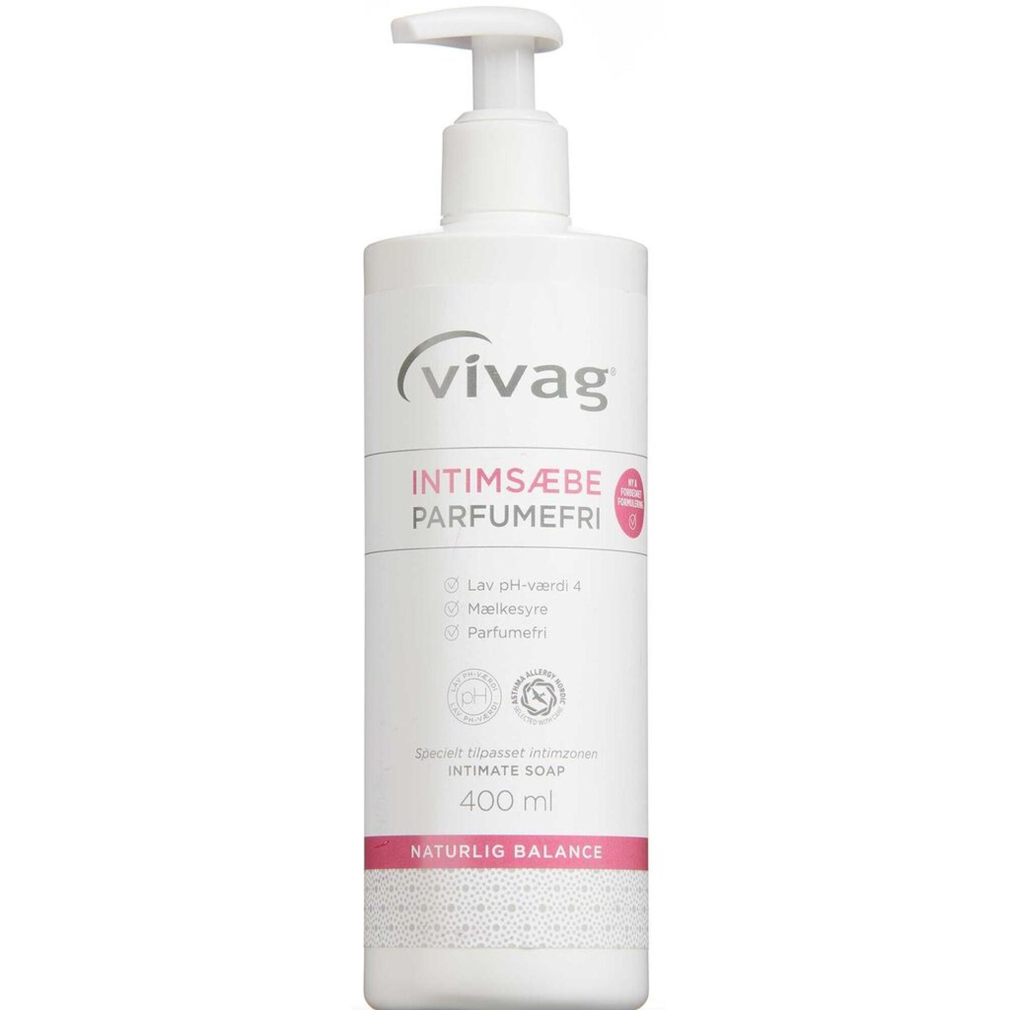Vivag Intimsæbe Parfumefri er mild og skånsom samt tilpasset den intime zone. Den indeholder mælkesyre og har en lav pH-værdi på 4, som svarer til den naturlige pH-værdi i den intime zone. Ny formulering giver sæben en fyldigere konsistens samtidig med, at de velkendte egenskaber af Vivag Intimsæbe bibeholdes.