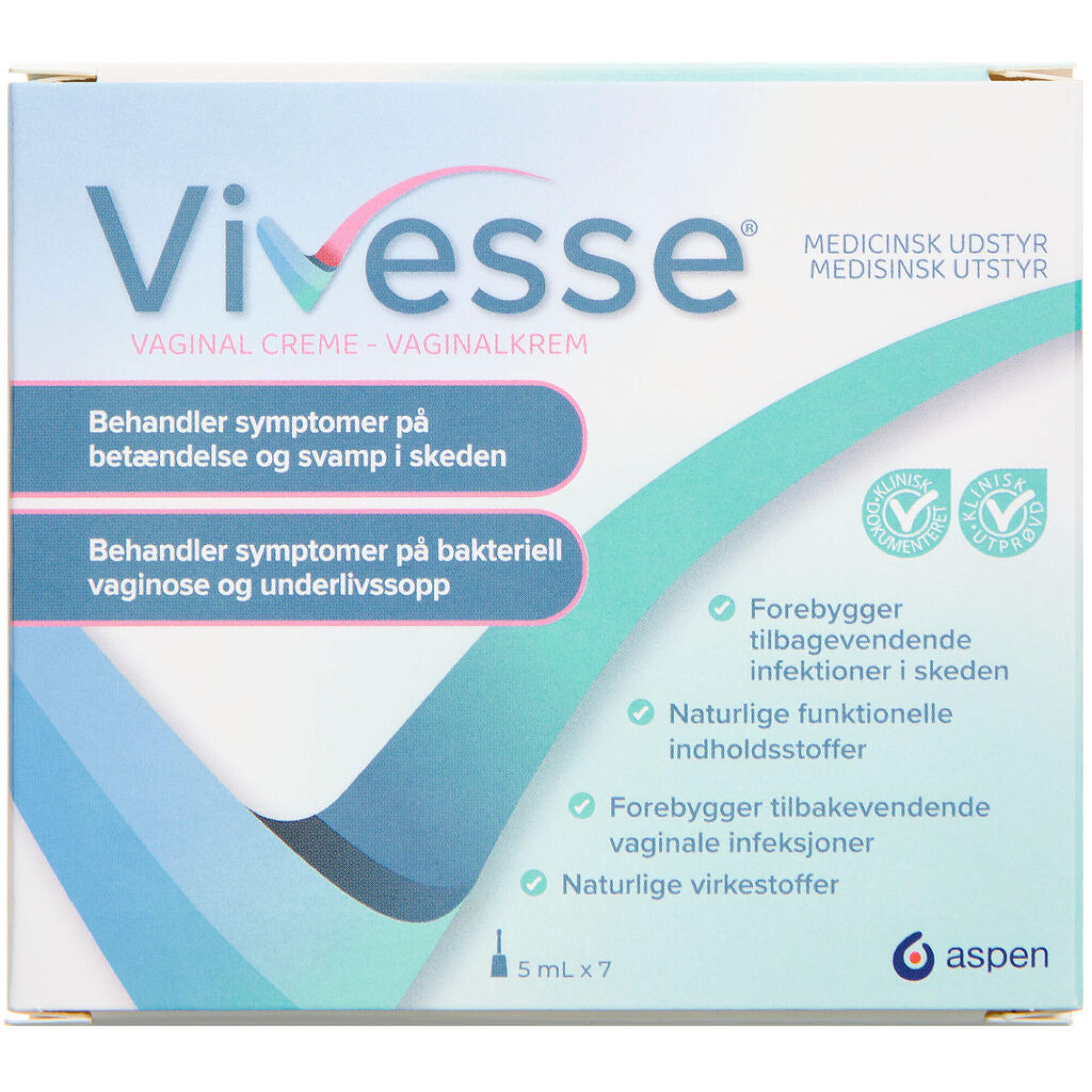 Vivesse er et 2-i-1 produkt, som både behandler symptomer på bakteriel vaginose og vulvovaginal candidiasis. Lindrer rødme, kløe og udflåd. Vivesse kan også bruges præventivt mod recidiverende vaginale infektioner og i tillæg til behandling med svampemidler. Vivesse er et CE-mærket medicinsk udstyr, der ved påføring giver en beskyttende barrierefunktion og tilfører mælkesyre, som genopretter den naturlige pH i skeden.